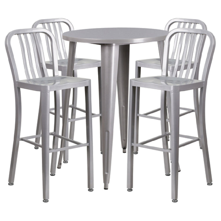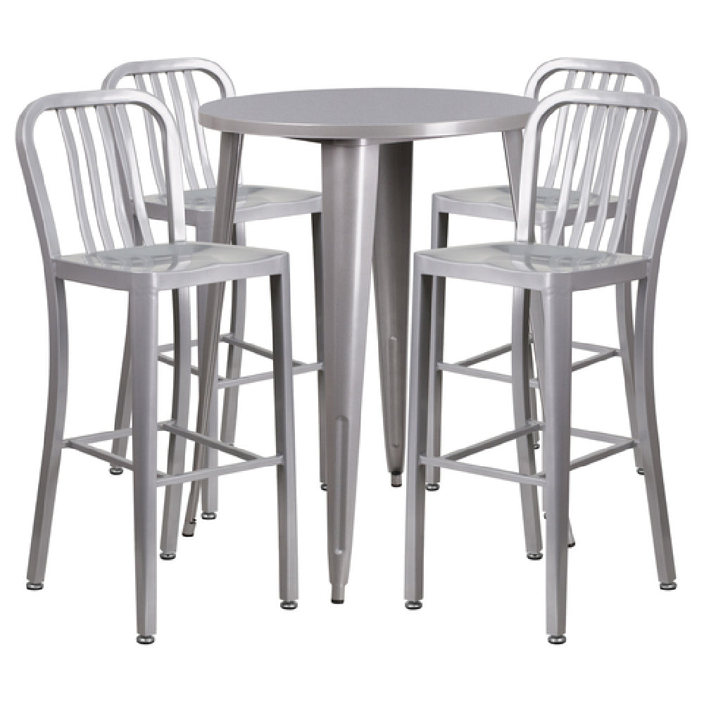 Flash Furniture CH-51090BH-4-30VRT-SIL-GG Table and Bar Stool Set is an expertly designed furniture ensemble that caters to both commercial and residential settings, providing versatility and style. The set includes a round, bar-height table measuring 30 inches in diameter and 41 inches in height, featuring a smooth top with a 1-1/4 inch thick edge reinforced by a brace underneath for added stability. Accompanying the table are four bar stools, each with dimensions of 15-1/2 inches in width, 20 inches in depth, and 43 inches in height, equipped with vertical slat backs and footrests for comfort. Constructed from durable metal with a sleek powder coat finish, this set is optimized for both indoor and outdoor use, ensuring longevity and adaptability in various environments. The table includes rubber floor glides, while the stools feature adjustable floor glides, providing protection and stability on different floor surfaces. Shipped in two boxes, this set requires assembly, with in-stock items usually dispatched within 24 hours. The silver color scheme adds a modern touch, making this furniture set a practical and stylish choice for diverse markets ranging from hospitality venues to home dining areas.