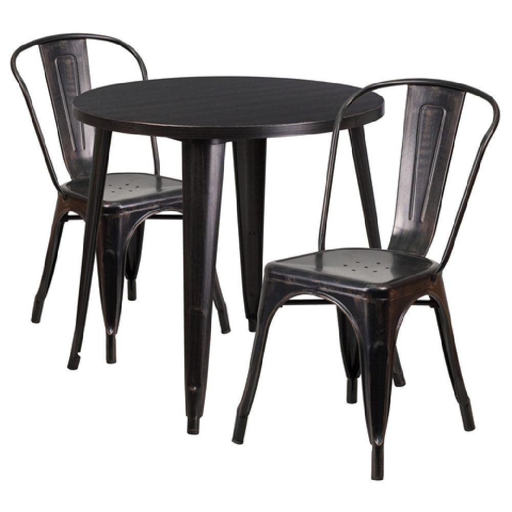 Flash Furniture CH-51090TH-2-18CAFE-BQ-GG Table and Chair Set offers a functional and stylish solution for both commercial and residential settings, perfectly blending form and function. This versatile set includes a round table measuring 30 inches in diameter and standing at a height of 29-1/2 inches, featuring a smooth, robust top that is 1-1/4 inches thick, with a supportive brace underneath for added stability. Complementing the table are two metal chairs, each with dimensions of 18 inches in width, 20 inches in depth, and 33 inches in height. The chairs feature a curved back with a vertical slat design, and the seat is equipped with drain holes, ensuring durability and quick drying when used outdoors. A cross brace under each seat enhances strength, while rubber floor glides protect surfaces from scratches. The entire set boasts a durable powder coat finish in a sleek black and antique gold color scheme, making it suitable for both indoor and outdoor environments. Shipped in two boxes with assembly required, this set is ideal for versatile use, from patios and cafes to dining spaces, offering a practical yet elegant addition to any space. In-stock items typically ship within 24 hours, ensuring a quick delivery turnaround.