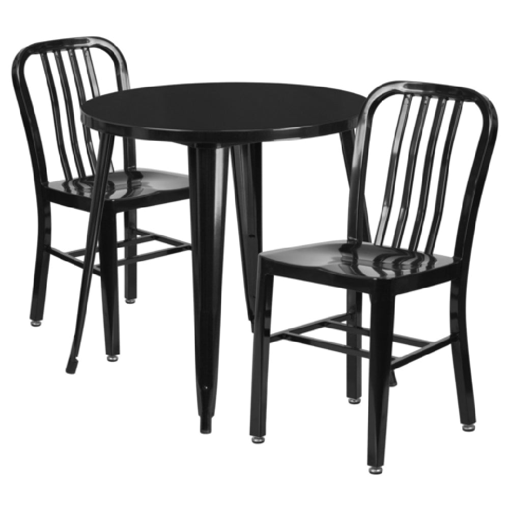 The Flash Furniture CH-51090TH-2-18VRT-BK-GG Table and Chair Set includes a meticulously designed 30-inch diameter table with a height of 29-1/2 inches, boasting a round, smooth top with a 1-1/4 inch thick edge. It is reinforced with a brace underneath for enhanced stability, making it suitable for both commercial and residential indoor/outdoor use. The set features two chairs measuring 15-1/2 inches in width, 20 inches in depth, and 33-1/4 inches in height. These chairs are equipped with vertical slat backs and a robust metal construction with a powder coat finish, providing durability and style. The table is designed with rubber floor glides, while the chairs offer adjustable floor glides to accommodate various floor surfaces, ensuring stability and protection. This set, available in black, is shipped in two boxes and requires assembly. It is an ideal solution for versatile seating arrangements in cafes, patios, or dining areas, combining function and aesthetic appeal. In-stock items typically ship within 24 hours, emphasizing convenience and prompt delivery for diverse market needs.