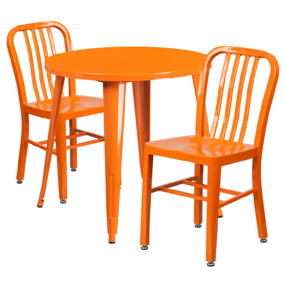 Flash Furniture CH-51090TH-2-18VRT-OR-GG Table And Chair Set includes (1) 30" dia. x 29-1/2"H round table and (2) 15-1/2"W x 20"D x 33-1/4"H chairs, offering a robust and versatile seating solution for both commercial and residential environments. The table features a smooth top with a 1-1/4" thick edge and a brace underneath for added stability. Its rubber floor glides ensure minimal movement and floor protection. The chairs are designed with a vertical slat back and come with adjustable floor glides, allowing for customization on uneven surfaces. Constructed from metal with a durable powder coat finish, this set is suitable for indoor and outdoor use and comes in a vibrant orange color, adding a pop of color to any setting. The set requires assembly and is conveniently shipped in two boxes. With the capability to ship in stock items within 24 hours, it provides a timely solution for dining and seating needs. This product is a great choice for those seeking practical, durable, and stylish furniture solutions for various settings.