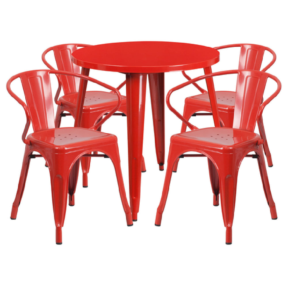 The Flash Furniture CH-51090TH-4-18ARM-RED-GG Table and Chair Set includes a 30-inch diameter round table standing at 29-1/2 inches in height. This set features a smooth top with a 1-1/4 inch thick edge and a supporting brace underneath, ensuring stability and durability. Accompanying the table are four chairs, each designed with a curved and vertically slatted back that incorporates integrated arms for added comfort. The chairs also include drain holes in the seat and a cross brace under each seat for enhanced strength. Constructed from metal with a powder coat finish, this set offers robust durability suitable for both indoor and outdoor settings. The addition of rubber floor glides helps protect surfaces from scratches, making it ideal for commercial and residential use. Available in a striking red color, this set requires assembly and is conveniently shipped in two boxes. Items typically ship within 24 hours if in stock, providing a quick and efficient solution for those looking to enhance their dining or outdoor spaces with a vibrant and durable furniture option.