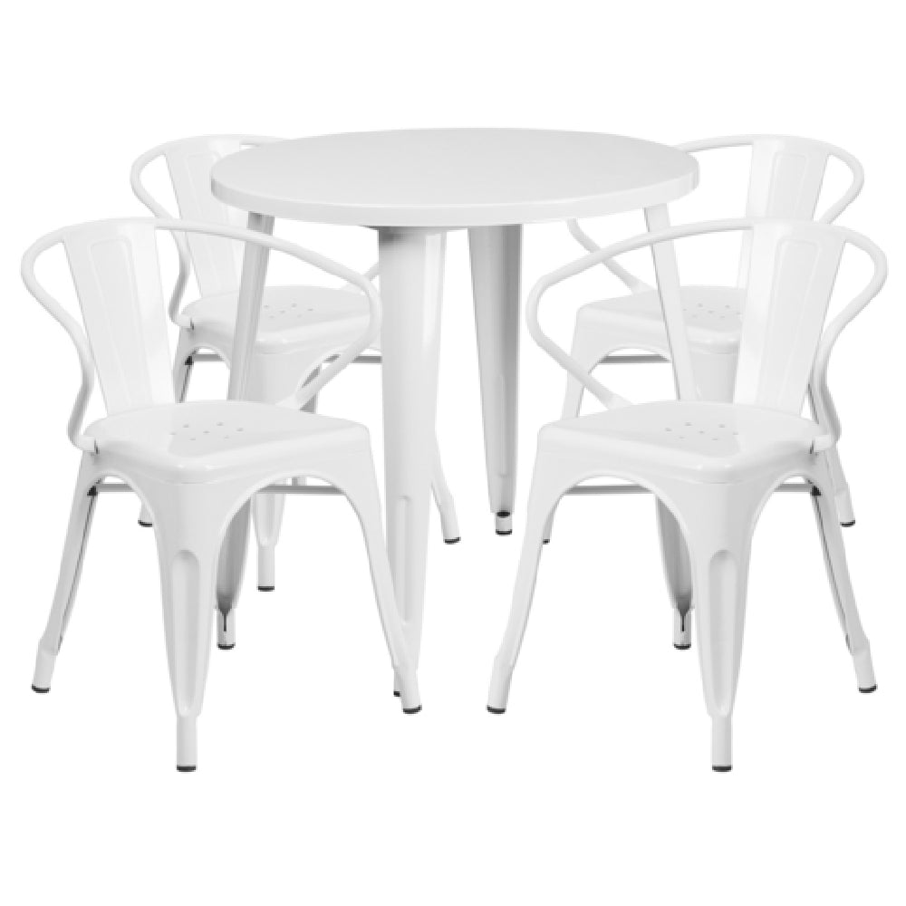 The Flash Furniture CH-51090TH-4-18ARM-WH-GG Table and Chair Set combines functionality and style for both commercial and residential settings. This set includes a 30-inch diameter by 29-1/2-inch high table with a round, smooth top and a 1-1/4-inch thick edge, supported by a brace underneath for enhanced stability. Complementing the table are four chairs, each designed with a curved frame and vertical slat back, integrated arms, and practical drain holes in the seat. The cross brace under each seat provides additional support, ensuring durability. Crafted from metal with a powder coat finish, this set is designed to withstand the demands of indoor and outdoor use. The inclusion of rubber floor glides protects flooring surfaces, making it suitable for various environments. Assembly is required, and the product ships in two boxes, with in-stock items typically dispatched within 24 hours. Available in white, this table and chair set offers versatility and robust construction, meeting the diverse needs of restaurant patios, cafes, and home dining areas with ease.