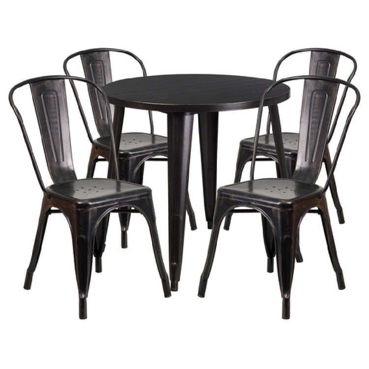 Flash Furniture CH-51090TH-4-18CAFE-BQ-GG Table And Chair Set includes a 30-inch diameter round table with a height of 29-1/2 inches, featuring a smooth top and a 1-1/4 inch thick edge, supported by a brace underneath for stability. The set also includes four chairs, each measuring 18 inches wide, 20 inches deep, and 33 inches high, designed with a curved back and vertical slats, along with drain holes in the seat for added convenience. These chairs also feature a cross brace under the seat for enhanced support. Constructed from durable metal with a powder coat finish, the set comes in a stylish black and antique gold color. The rubber floor glides ensure protection for floors during use. Suitable for both indoor and outdoor settings, this set is designed for commercial and residential use. Assembly is required, and the product is shipped in two boxes. With in-stock items typically shipping within 24 hours, this table and chair set provides a versatile seating solution for diverse environments, combining functionality and style.