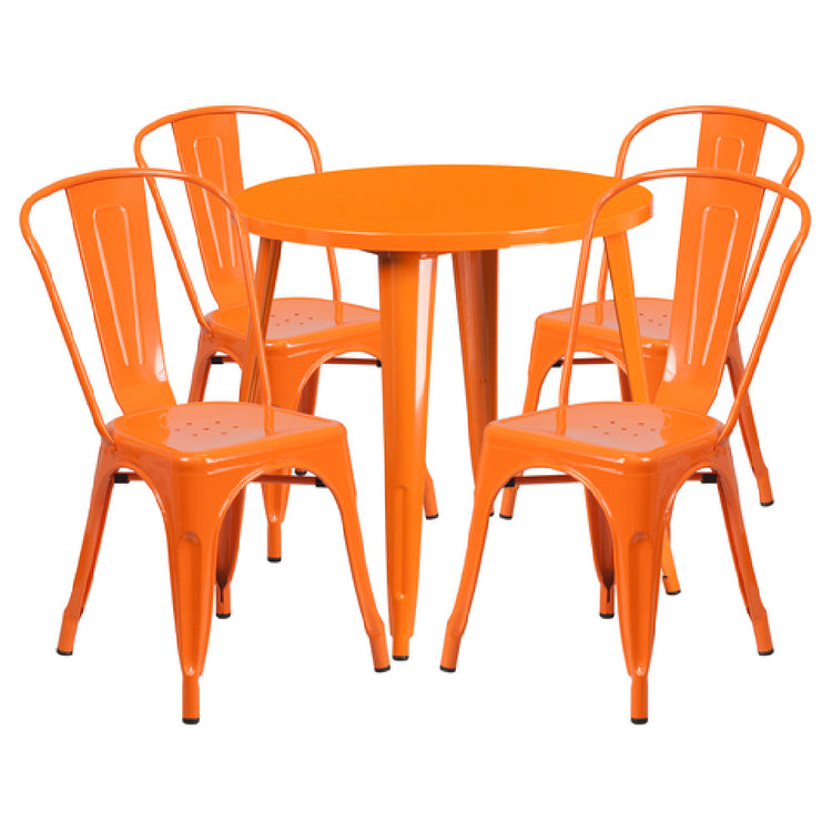 The Flash Furniture CH-51090TH-4-18CAFE-OR-GG Table and Chair Set is a versatile addition to both commercial and residential spaces, designed for indoor and outdoor use. This set includes a round table measuring 30 inches in diameter and 29-1/2 inches in height, featuring a smooth top with a 1-1/4 inch thick edge and a brace underneath for added stability. The set also comprises four chairs, each 18 inches wide, 20 inches deep, and 33 inches high, with a curved back and vertical slats for ergonomic support. The chairs are equipped with drain holes in the seat and a cross brace under the seat, enhancing durability and comfort. Constructed from metal with a powder coat finish, the table and chairs are built to withstand various environmental conditions. Rubber floor glides provide protection for flooring surfaces. Shipped in two boxes, this set requires assembly and is typically available for shipping within 24 hours. The vivid orange color adds a vibrant touch to any setting, making it a practical and stylish choice for diverse market segments seeking durable and visually appealing furniture solutions.