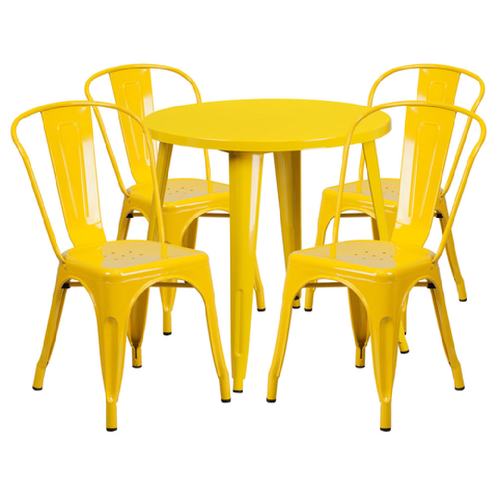 The Flash Furniture CH-51090TH-4-18CAFE-YL-GG table and chair set is a versatile and durable option for both commercial and residential environments. This set includes a round table with a smooth top measuring 30 inches in diameter and 29-1/2 inches in height, featuring a 1-1/4 inch thick edge and a brace underneath for added stability. Complementing the table, the set comes with four chairs, each measuring 18 inches wide, 20 inches deep, and 33 inches high. The chairs are designed with a curved back and vertical slats, providing both style and comfort. Each chair also includes drain holes in the seat and a cross brace under the seat, enhancing functionality and support. Constructed from metal with a powder coat finish, this set is designed to withstand various elements, making it suitable for indoor and outdoor use. Rubber floor glides are included to protect flooring surfaces from scratches. The vibrant yellow color adds a striking visual appeal to any setting. Assembly is required, and the product is shipped in two boxes. Typically, in-stock items are shipped within 24 hours, ensuring a prompt delivery for customers. This set is an ideal choice for those seeking a stylish and practical furniture solution.