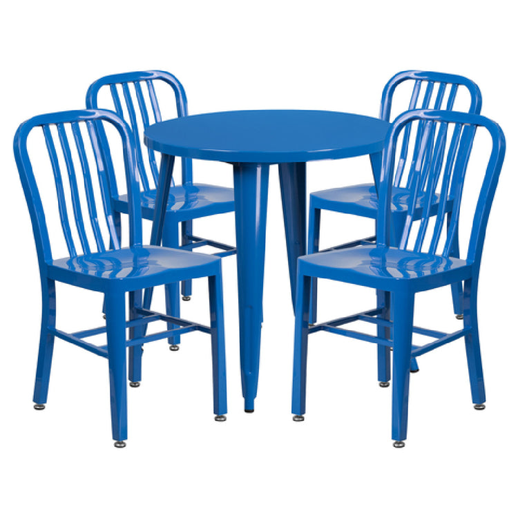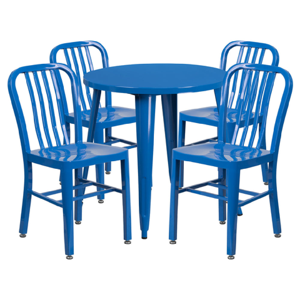 The Flash Furniture CH-51090TH-4-18VRT-BL-GG Table And Chair Set is a versatile and stylish addition to both commercial and residential spaces, designed to offer durability and functionality for a variety of settings. This set features a 30-inch diameter table with a height of 29-1/2 inches, boasting a round, smooth top and a robust 1-1/4 inch thick edge. The table is reinforced with a brace underneath the top for added stability, making it suitable for both indoor and outdoor use. Accompanying the table are four chairs, each measuring 15-1/2 inches in width, 20 inches in depth, and 33-1/4 inches in height. The chairs are designed with a vertical slat back, crafted from metal, and finished with a powder coat for enhanced durability. Rubber floor glides on the table and adjustable floor glides on the chairs ensure adaptability on various surfaces. Available in a vibrant blue color, this set requires assembly and is shipped in two boxes. Items in stock typically ship within 24 hours, providing a prompt solution for furnishing needs. This product is ideal for businesses looking to invest in long-lasting furniture solutions that cater to a wide range of environments and uses.