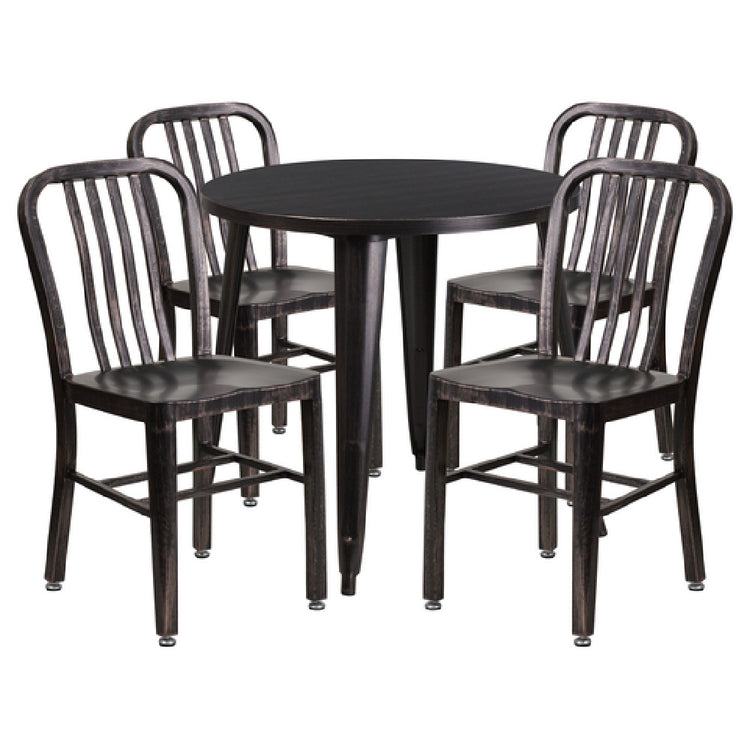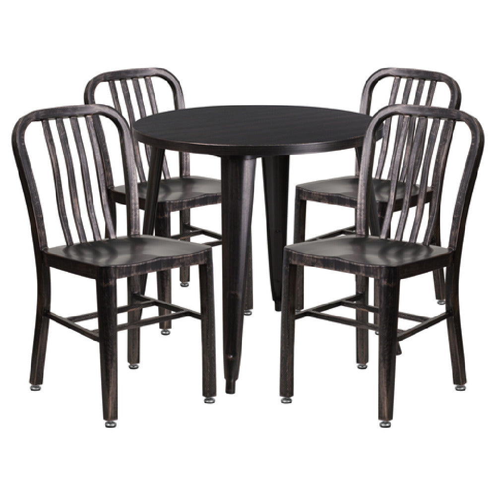 The Flash Furniture CH-51090TH-4-18VRT-BQ-GG Table and Chair Set is a versatile ensemble designed for both commercial and residential use, accommodating various indoor and outdoor settings. This set features a round table with a 30-inch diameter and stands at a height of 29-1/2 inches. The smooth tabletop is complemented by a 1-1/4 inch thick edge and a supportive brace underneath, ensuring stability and durability. Included in the set are four chairs, each measuring 15-1/2 inches in width, 20 inches in depth, and 33-1/4 inches in height, with a stylish vertical slat back design. The chairs and table are crafted from metal with a powder coat finish, offering resilience and a sleek appearance. For added convenience, the table includes rubber floor glides, while the chairs are equipped with adjustable floor glides, allowing for easy placement and adaptability on uneven surfaces. Available in black and antique gold, this set requires assembly and is shipped in two boxes. Its quick shipping within 24 hours for in-stock items makes it an efficient choice for those in need of immediate furnishing solutions. This set is ideal for cafes, restaurants, or personal patio spaces, offering a blend of functionality and aesthetic appeal.