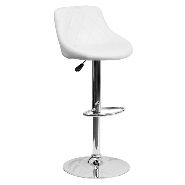 The Flash Furniture CH-82028A-WH-GG Swivel Bar Stool Adjustable Height Contemporary Style is a versatile seating solution designed for residential environments. This stool features an adjustable height mechanism, allowing seamless transitions from counter to bar height, catering to diverse seating needs. Its contemporary style is highlighted by a sleek low back design and an upholstered mid-back bucket seat, offering both comfort and modern aesthetic appeal. The stool is equipped with a gas lift for effortless height adjustment and includes a convenient footrest for added comfort during prolonged use. The base of the stool measures 17-5/8 inches in diameter and is crafted from chrome, adding a touch of elegance while ensuring stability. Safety is a priority with the inclusion of CA117 fire retardant foam, providing peace of mind for users. The stool is finished in white vinyl, a material known for its durability and ease of maintenance. Assembly is required, and in-stock items typically ship within 24 hours, ensuring a prompt addition to any space. This product effectively combines style, functionality, and safety, making it a valuable addition to contemporary homes looking for adaptable seating options.