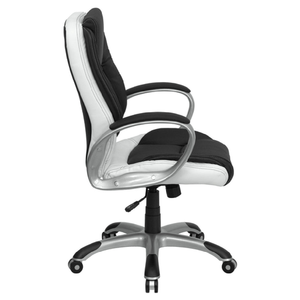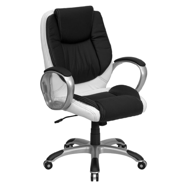 The Flash Furniture CH-CX0217M-GG Executive Swivel Office Chair is designed with functionality and comfort in mind, catering to the needs of professionals across various industries. With an adjustable height range of 39-1/2" to 42-1/2", this chair adapts seamlessly to different work environments and user preferences. A mid-back design with a contoured back and contoured waterfall seat ensures ergonomic support, promoting better posture and reducing strain during long working hours. The chair's LeatherSoft upholstery combines the durability of leather with the softness of fabric, offering a luxurious seating experience. It can support up to 250 lbs, making it robust enough for diverse users. Built-in lumbar support and a tilt lock mechanism, complemented by a tilt tension adjustment knob, allow for personalized comfort settings. Padded loop arms add to the chair's ergonomic design, ensuring additional support and relaxation for the arms. The heavy-duty titanium nylon base with black end caps and dual wheel casters provides stability and ease of mobility. Furthermore, the chair contains CA117 fire retardant foam, ensuring safety in various settings. Available in a two-tone black and white finish, this office chair requires assembly, with in-stock items typically shipping within 24 hours, offering both practicality and style for modern workspaces.