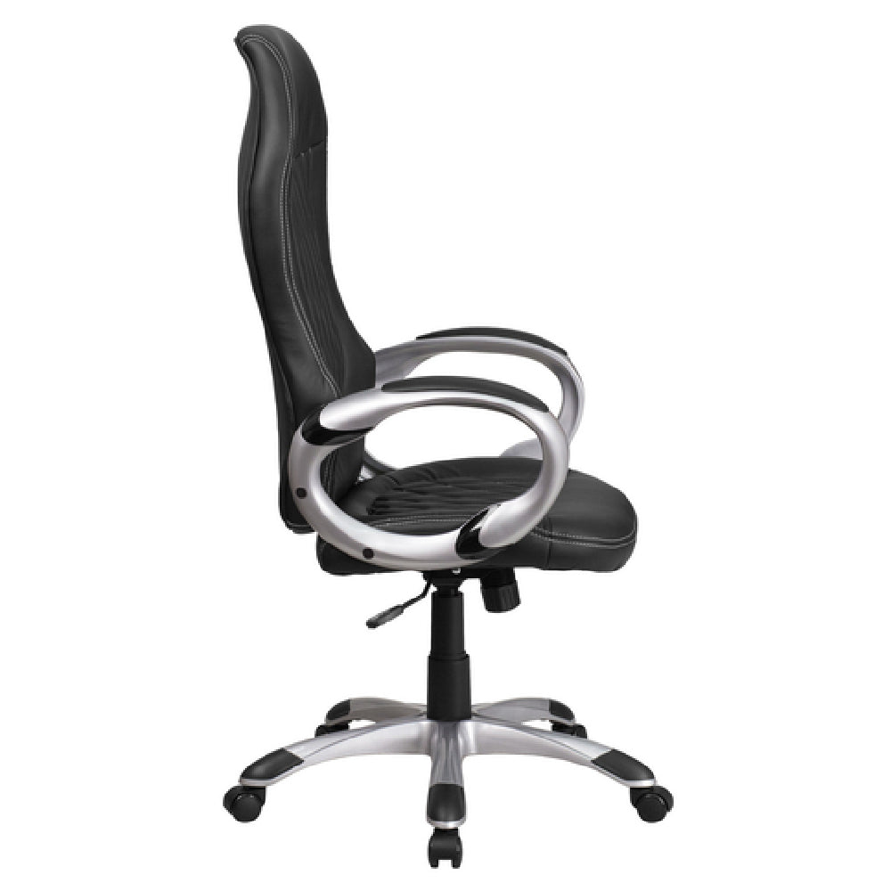 The Flash Furniture CH-CX0906H-BK-GG Executive Swivel Office Chair is a highly functional seating solution with a versatile height range of 47-1/2" to 51". Designed to support up to 250 lb., this chair is tailored for professional office settings. Its high back design, complemented by a headrest and built-in lumbar support, promotes ergonomic comfort, making it suitable for long working hours. The waterfall seat enhances leg circulation, while the vinyl upholstery with contrasting white stitching provides a sleek, professional appearance. Equipped with a tilt lock mechanism and a tilt tension adjustment knob, users can customize their seating position with ease. Padded loop arms add an extra layer of comfort, and the chair is constructed with CA117 fire retardant foam for safety. The heavy-duty silver nylon base, featuring black end caps and dual wheel casters, ensures stability and mobility across various floor types. Assembly is required, and products typically ship within 24 hours, ensuring a quick setup for your workspace. Ideal for executives, managers, and professionals who prioritize both style and performance in office furniture, this chair meets diverse needs while maintaining high standards of quality and durability.