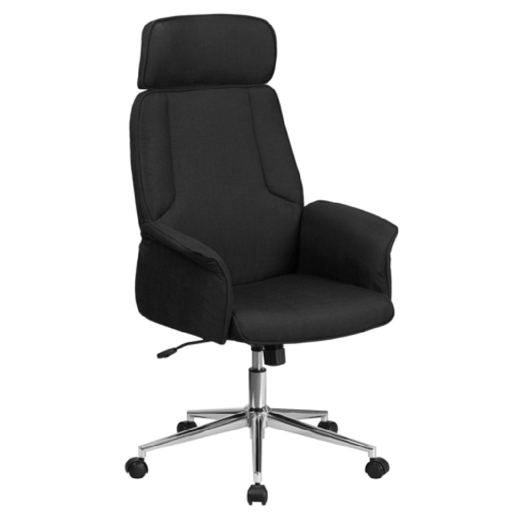 The Flash Furniture CH-CX0944H-BK-GG Executive Swivel Office Chair 46" to 49-1/2" Adjustable Height is engineered to meet the ergonomic and aesthetic needs of modern office environments. This chair features a high back design that integrates a headrest and built-in lumbar support, promoting comfort and proper posture during extended use. Its waterfall seat aids in reducing leg strain, enhancing overall user comfort. The chair's adjustability is highlighted by its adjustable height range of 46" to 49-1/2", accommodating a variety of user preferences and desk heights. The tilt lock mechanism and tilt tension adjustment knob offer personalized reclining options, while the curved padded arms provide additional support. Constructed with CA117 fire retardant foam and durable fabric upholstery, this chair ensures safety and durability. The heavy-duty chrome base, equipped with dual wheel casters, allows for smooth mobility across different floor surfaces. With a weight capacity of 250 lb., it caters to a wide range of users. Suitable for various professional settings, this chair is a practical choice for offices seeking a balance of style, functionality, and comfort. Assembly is required, and the product is typically ready for shipment within 24 hours, ensuring quick access for businesses in need of immediate seating solutions.