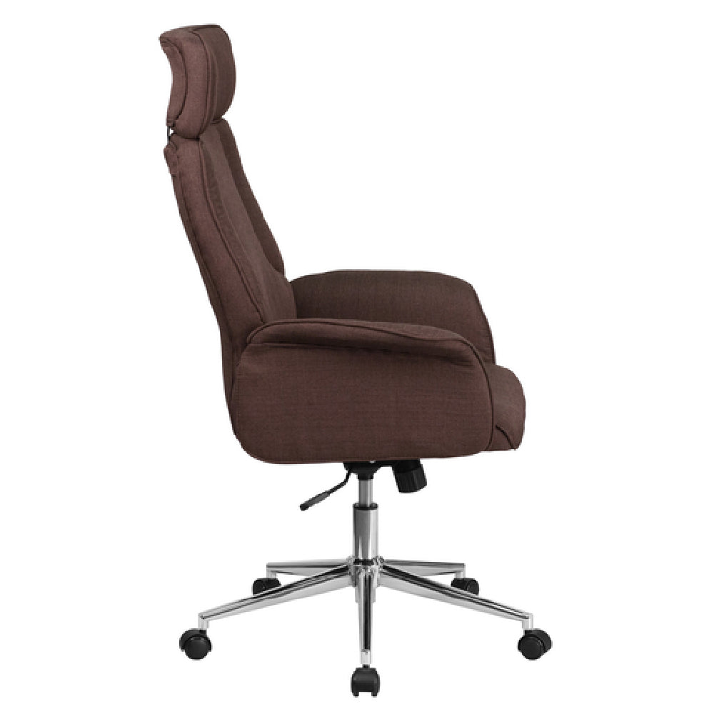 The Flash Furniture CH-CX0944H-BN-GG Executive Swivel Office Chair is a versatile seating solution designed for modern workspaces. With an adjustable height range of 46 to 49-1/2 inches, this executive chair accommodates a variety of desk heights, ensuring ergonomic comfort for users up to 250 pounds. Its high back design, complemented by a waterfall seat and a built-in headrest, provides essential support for prolonged sitting periods. The chair's fabric upholstery is accentuated by welt trim, adding a touch of elegance to its functional design. For enhanced user comfort, the chair includes built-in lumbar support and features a tilt lock mechanism along with a tilt tension adjustment knob, allowing users to customize their seating experience. The curved padded arms offer additional support, while the chair's CA117 fire retardant foam ensures safety in the workplace. A heavy-duty chrome base equipped with dual wheel casters enables smooth mobility across various flooring types. The Flash Furniture Executive Swivel Office Chair is an ideal choice for executives seeking a blend of style, durability, and ergonomic functionality. Assembly is required, and in-stock items typically ship within 24 hours, making it a convenient option for swift office upgrades.