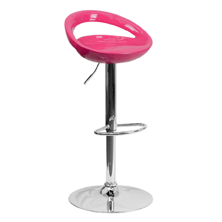 Flash Furniture CH-TC3-1062-PK-GG Swivel Bar Stool Adjustable Height Contemporary Style is a dynamic seating solution designed for modern residential spaces. Featuring an adjustable height mechanism, this stool transitions seamlessly from counter to bar height, accommodating various settings and needs. The low back design, coupled with a plastic rounded back and contoured seat, ensures comfort and support, making it a practical addition to contemporary kitchens or dining areas. The gas lift feature allows for effortless height adjustments, enhancing user convenience. A footrest integrated into the design provides added comfort, encouraging relaxation. The stool's stability is ensured by a 17-5/8" diameter chrome base, which not only enhances its aesthetic appeal but also provides a sturdy foundation. Constructed from durable ABS plastic, the stool showcases a vibrant pink color, adding a pop of color to any interior decor. While assembly is required, in-stock items typically ship within 24 hours, ensuring prompt delivery. This versatile bar stool is designed specifically for residential use, making it an ideal choice for homeowners seeking a blend of style, functionality, and vibrant design in their furniture selections.