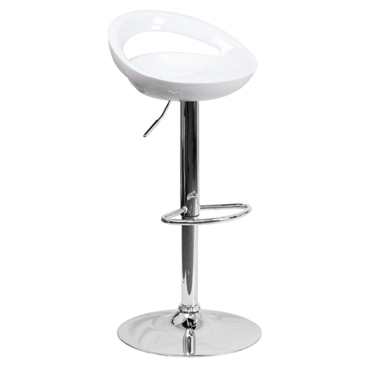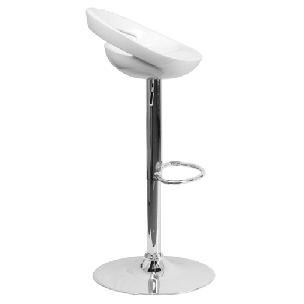 The Flash Furniture CH-TC3-1062-WH-GG Swivel Bar Stool Adjustable Height Contemporary Style is a versatile seating solution designed to adapt to various residential spaces. Featuring a modern low-back design, this stool highlights a rounded, contoured plastic seat and back, ensuring both comfort and elegance. The stool's adjustable height function is enabled by a gas lift mechanism, allowing seamless transitions from counter to bar height, making it suitable for kitchens and home bars. Its 17-5/8" diameter chrome base provides stability and is complemented by a practical footrest for added comfort during extended use. Constructed from durable ABS plastic, the stool is ideal for everyday use and offers a sleek white finish that complements contemporary interiors. The product is designed for easy assembly and convenience, with in-stock items typically shipping within 24 hours. This bar stool offers a balance of style, functionality, and adaptability, fitting well in diverse residential environments seeking modern and practical seating solutions.