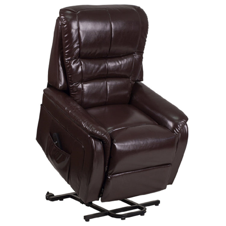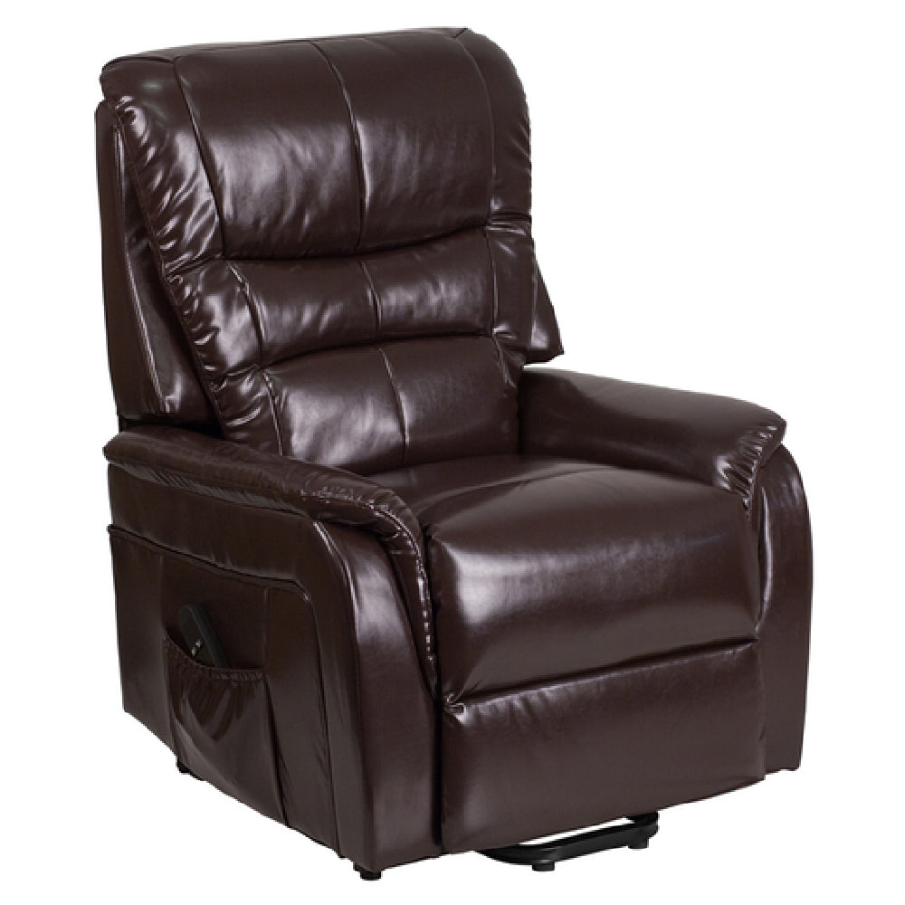 The Flash Furniture CH-US-153062L-BRN-LEA-GG Hercules Lift Recliner is designed with contemporary appeal, embodying both comfort and practicality. With dimensions of 33"W x 32" - 67"D x 44"H (57"H when fully lifted), this recliner provides ample space for relaxation. It features upholstered pillow back cushions and a padded seat, ensuring comfort and support. The padded upholstered arms add an extra layer of coziness. This model includes a right side pocket for convenient storage, enhancing its functional design. The recliner's operation is streamlined with remote control access, facilitating ease of use. Constructed with sinuous wire springs and CA117 fire retardant foam, it prioritizes both durability and safety. Upholstered in LeatherSoft, a blend of leather and polyurethane, it offers the look and feel of leather with enhanced softness. Its brown color provides a warm, inviting aesthetic suitable for various environments. The Hercules Lift Recliner is ideal for residential users seeking comfort and style, as well as healthcare facilities that require reliable, easy-to-clean seating solutions. Assembly is required, and in-stock items typically ship within 24 hours, ensuring a quick and efficient purchase process. This recliner is a versatile addition to any space, combining modern design with functional excellence.