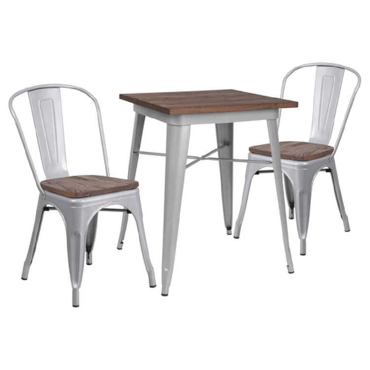 The Flash Furniture CH-WD-TBCH-1-GG Table And Chair Set features a perfectly sized 23-1/2" square table, paired with two stackable chairs, making it a versatile choice for various environments. This set combines style and durability, with an elm wood tabletop supported by a robust galvanized steel frame, finished in an elegant silver hue. Its compact dimensions make it suitable for small to medium-sized spaces, while the stackable design of the chairs ensures convenient storage, optimizing space when not in use. Ideal for cafes, restaurants, or home settings, this set balances aesthetic appeal with practical functionality. The use of high-quality materials like elm wood and galvanized steel not only enhances the visual appeal but also ensures longevity, making it a valuable addition to any interior design scheme. The Flash Furniture CH-WD-TBCH-1-GG set is engineered to meet the needs of various market segments, from hospitality to residential, offering a blend of modern design and sturdy construction that caters to both aesthetic and practical demands.