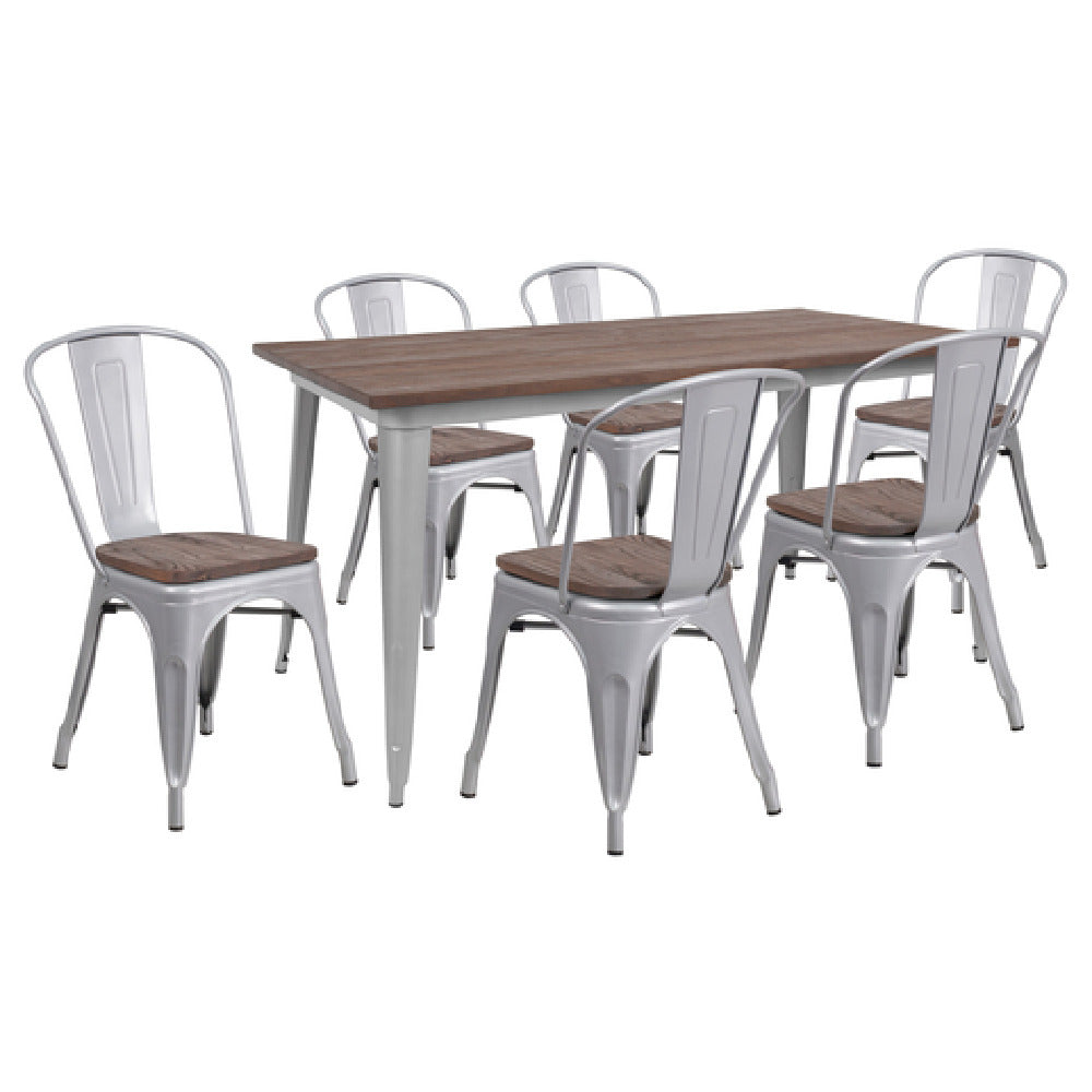 The Flash Furniture CH-WD-TBCH-14-GG Table And Chair Set is a versatile and robust furniture solution designed for various settings, including commercial spaces and home environments. This set features a 30-1/4" x 60" rectangular table, providing ample space for dining, meetings, or collaborative work. The table is crafted with an elm wood top, offering a natural and elegant aesthetic that complements a variety of décor styles. Supporting the table is a galvanized steel frame, which ensures stability and long-lasting durability, making it suitable for high-traffic areas. Accompanying the table are six stackable chairs, allowing for convenient storage and easy rearrangement to suit different occasions. The inclusion of stackable chairs is particularly advantageous for businesses and venues that require flexible seating arrangements or need to optimize space. The silver finish of the steel frame adds a modern touch to the set, enhancing its appeal in contemporary settings. The Flash Furniture CH-WD-TBCH-14-GG Table And Chair Set combines functionality with stylish design, making it an ideal choice for restaurants, cafes, offices, and homes seeking adaptable and reliable furniture solutions.