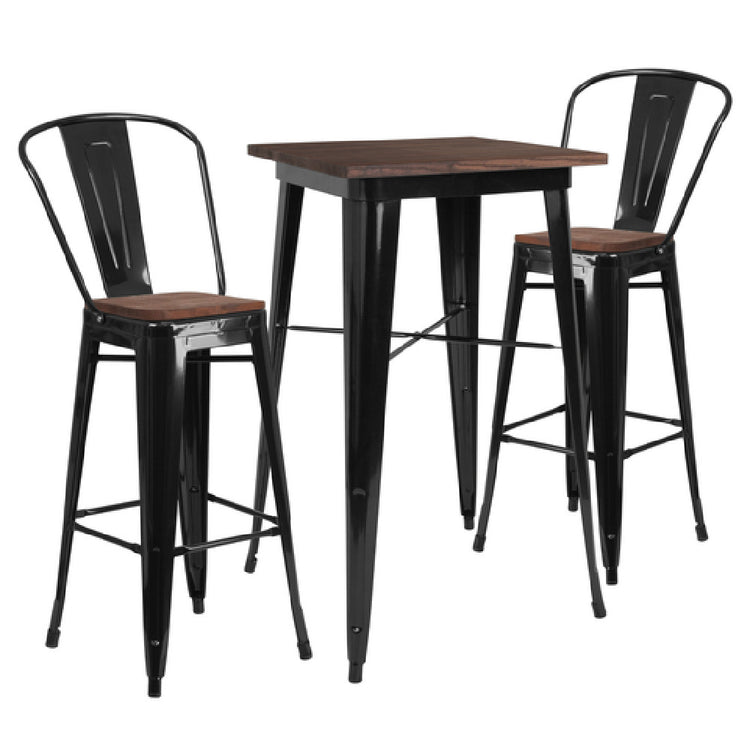 The Flash Furniture CH-WD-TBCH-16-GG Table and Chair Set is a compact and stylish addition to any small dining area, café, or office break room. This set includes a 23-1/2" square table, complemented by two stools, making it ideal for intimate gatherings or collaborative workspaces. The table features an elm wood top, which provides a natural and elegant aesthetic, while the galvanized steel frame ensures durability and stability, supporting frequent usage. The combination of wood and steel materials offers a modern industrial design that suits various interior styles. Available in black, this set is versatile enough to blend seamlessly into different environments, from contemporary to rustic settings. Its compact size makes it a practical solution for small spaces, maximizing functionality without sacrificing style. The Flash Furniture CH-WD-TBCH-16-GG Table and Chair Set is an excellent choice for those seeking a balance between form and function, providing both aesthetic appeal and practical use across different market segments, including hospitality, office, and residential spaces.
