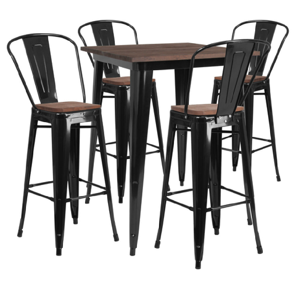 Flash Furniture CH-WD-TBCH-19-GG Table and Chair Set is expertly crafted to meet the demands of various commercial and residential spaces. Featuring a 31-1/2" square table, this set includes four stools, providing a complete seating solution. The table and stools are designed with elm wood tops, offering a natural and stylish appearance that seamlessly blends with diverse interior decor. The galvanized steel frame enhances the durability and stability of the set, ensuring long-lasting performance in high-traffic environments. The sleek black finish adds a modern touch, making it an appealing choice for contemporary settings. This combination of materials and design makes the Flash Furniture CH-WD-TBCH-19-GG Table and Chair Set a versatile addition to cafes, restaurants, and home dining areas. Its compact size is ideal for smaller spaces, while the quality construction ensures it can withstand the rigors of daily use. Whether for a bustling coffee shop or a cozy kitchen nook, this table and chair set delivers functionality and style in equal measure.