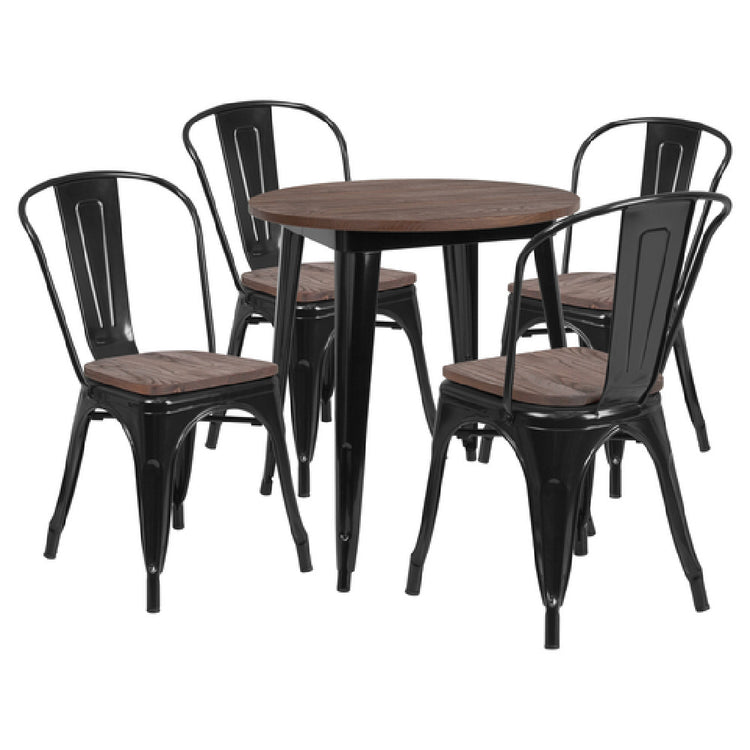 The Flash Furniture CH-WD-TBCH-24-GG Table and Chair Set stands out as a practical choice for a variety of settings, featuring a 26-inch round table complemented by four stackable chairs. Its elm wood top provides a classic and durable surface, while the galvanized steel frame ensures stability and resistance to wear, making it suitable for both indoor and outdoor use. This set's stackable design allows for easy storage and transportation, ideal for venues requiring flexibility in seating arrangements, such as event spaces, cafes, or small businesses. The black finish adds a sleek and modern touch, making it a versatile choice that can seamlessly fit into various decor styles. The compact design of the table and chairs is perfect for spaces that require efficient use of area, and the sturdy construction assures long-term use in high-traffic environments. Whether for commercial use or home settings, the Flash Furniture CH-WD-TBCH-24-GG offers a blend of functionality, durability, and style, meeting the demands of different market segments within the furniture industry. This set combines aesthetic appeal with practical features, making it a valuable addition to any space that prioritizes both style and usability.