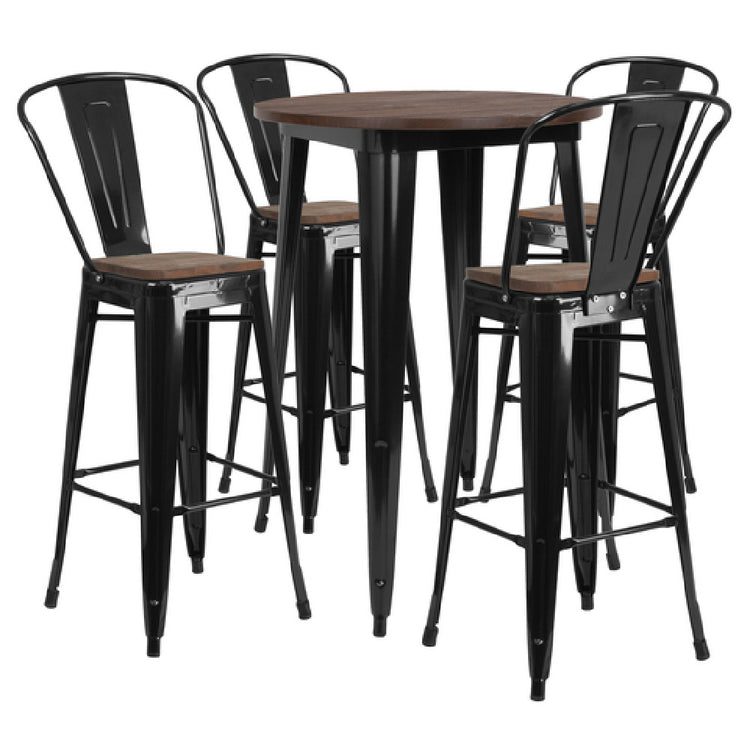 Flash Furniture CH-WD-TBCH-25-GG Table and Chair Set is a versatile furniture solution featuring a 30-inch round table paired with four stools, each designed to provide a balance of style and functionality. This set's table boasts an elm wood top, offering a classic and durable surface that is both aesthetically pleasing and resilient. The accompanying stools are crafted with the same attention to detail, ensuring a cohesive look that enhances any space. The entire set is supported by a galvanized steel frame, which provides strength and durability, making it suitable for various environments including cafes, bistros, and home dining spaces. This robust construction ensures that the furniture set can withstand daily use while maintaining its structural integrity and visual appeal. The set's black finish gives it a sleek, modern appearance, seamlessly integrating into diverse interior designs and catering to both commercial and residential markets. Whether used in a bustling restaurant or a cozy home kitchen, the Flash Furniture CH-WD-TBCH-25-GG Table and Chair Set combines practicality with a timeless aesthetic, meeting the needs of different customer segments seeking quality and style in their furniture investments.