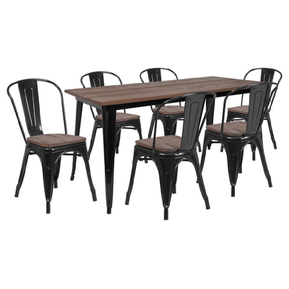 The Flash Furniture CH-WD-TBCH-28-GG Table And Chair Set is a versatile and functional furniture ensemble designed to accommodate various settings with ease. Featuring a 30-1/4" x 60" rectangular table, it offers ample surface area for dining, working, or gathering in both residential and commercial environments. The table's elm wood top adds a touch of natural elegance, while the galvanized steel frame ensures a sturdy and durable construction that withstands the rigors of daily use. This set includes six stackable chairs, providing convenient storage solutions and space-saving benefits, especially in dynamic environments like cafes, restaurants, or event halls. The chairs are designed to complement the robust table structure, enhancing the overall aesthetic appeal. With its combination of practical design and quality materials, the Flash Furniture CH-WD-TBCH-28-GG Table And Chair Set presents a compelling option for businesses seeking reliable furniture solutions that cater to diverse market segments. Whether for routine dining, special events, or collaborative workspaces, this set offers a seamless blend of functionality and style, meeting the needs of various industry players.