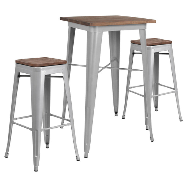 The Flash Furniture CH-WD-TBCH-3-GG Table And Chair Set is an elegantly designed furniture ensemble that combines practicality with modern aesthetics, perfect for a variety of settings. It includes a 23-1/2 inch square table and two backless stools, each featuring an elm wood top. The set is framed with galvanized steel, providing a robust and durable structure while maintaining a sleek, silver finish that complements diverse interior decors. The compact size of the table makes it a versatile choice for smaller dining areas, cafes, or even outdoor patios, where space optimization is crucial. The backless stools are designed to be conveniently stowed under the table when not in use, further enhancing space efficiency. This table and chair set is particularly appealing to urban dwellers, cafe owners, and those seeking a minimalist design without compromising on quality and durability. The combination of elm wood and galvanized steel not only adds to the longevity of the product but also offers an industrial chic aesthetic that is both stylish and functional. This set serves as an ideal solution for those looking to enhance their dining spaces with a touch of modern elegance and practicality.
