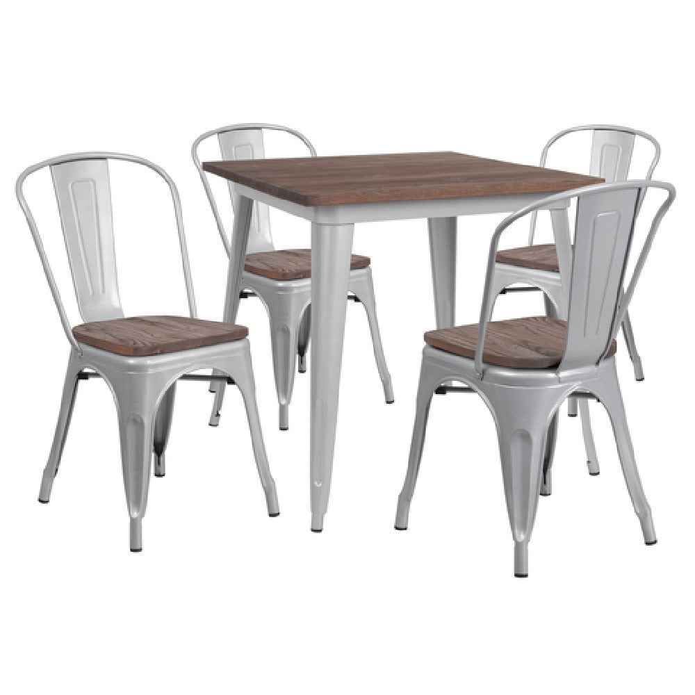 Flash Furniture CH-WD-TBCH-4-GG Table And Chair Set - a versatile and practical choice for various settings, including restaurants, cafes, and home dining areas. This set includes a 31-1/2" square table and four stackable chairs, offering a space-efficient solution for any environment. The table features an elm wood top, providing a durable and aesthetically pleasing surface that complements a range of decor styles. Its galvanized steel frame ensures sturdiness and long-lasting performance, making it ideal for both indoor and outdoor use. The chairs are designed to stack, allowing for easy storage and space maximization, catering to businesses with varying seating needs. The sleek silver finish of the frame adds a contemporary touch, enhancing the overall appeal of the set. This combination of functionality, style, and robust construction makes the Flash Furniture CH-WD-TBCH-4-GG Table And Chair Set a valuable addition to commercial and residential spaces, accommodating different market segments within the industry. By integrating quality materials with efficient design, this set meets the demands of high-traffic areas while maintaining an inviting atmosphere for diners.