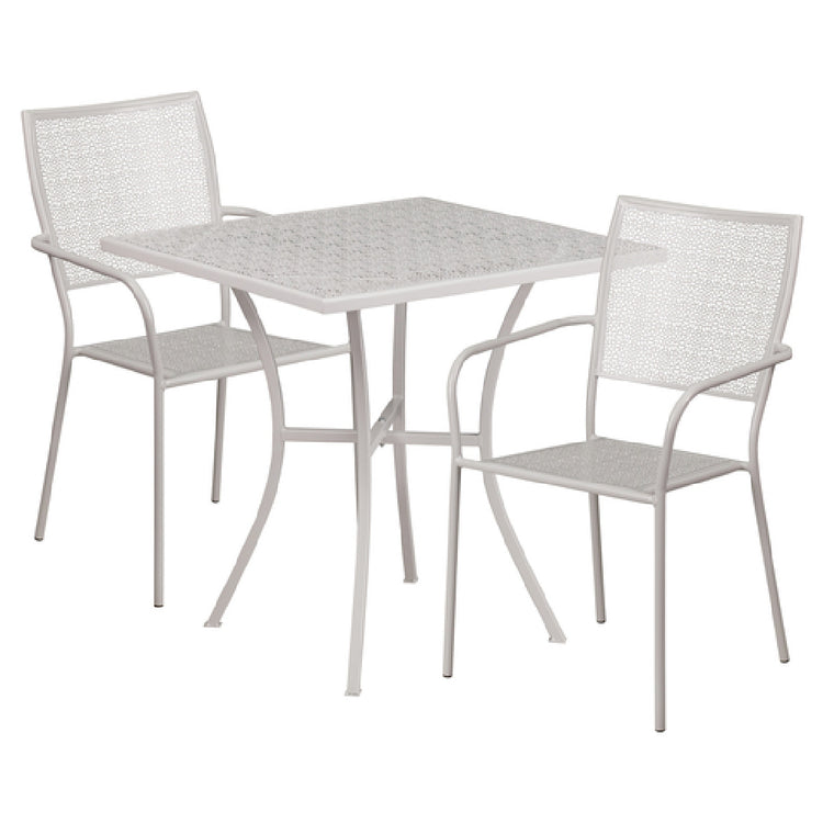 The Flash Furniture CO-28SQ-02CHR2-SIL-GG Patio Table Set is a versatile and stylish choice for both indoor and outdoor settings. This set includes a square table measuring 28"W x 28"D x 28-1/4"H, featuring a distinctive rain flower design top coupled with a 1" edge, offering a blend of aesthetics and functionality. Complementing the table, the set includes two stacking arm chairs with a square back, adorned with the same rain flower design on the back and seat. Each chair boasts a sturdy 1.2mm tubular steel frame, ensuring durability with a weight capacity of 300 lbs. The chairs can be conveniently stacked up to 8 chairs high for efficient storage. The light gray powder coat finish not only enhances the set’s visual appeal but also provides added resilience against the elements. Designed with plastic floor glides, this patio set prevents damage to flooring surfaces, making it ideal for any setting. Assembly is required for this set, which ships in two boxes, and in-stock items typically ship within 24 hours. With its stylish design and practical features, the Flash Furniture CO-28SQ-02CHR2-SIL-GG Patio Table Set is perfect for a variety of markets, from residential to commercial, seeking durable and attractive outdoor furniture options.