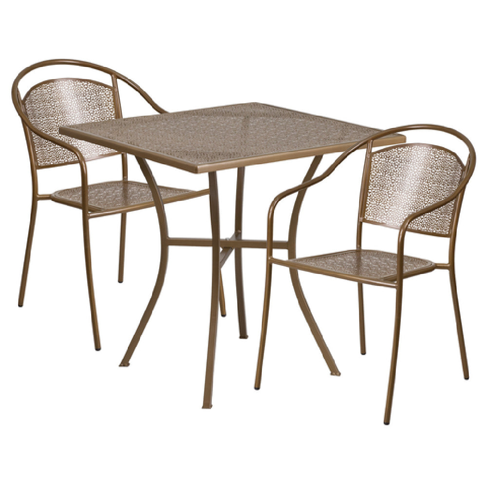 Flash Furniture CO-28SQ-03CHR2-GD-GG Patio Table Set stands out with its distinctive rain flower design on both the square tabletop and the round-back chairs, providing a touch of elegance to any setting. The table measures 28-W x 28-D x 28-1/4-H, making it a compact yet functional choice for both indoor and outdoor spaces. Accompanied by two stacking arm chairs, each with a sturdy 1.2mm tubular frame, the set ensures durability while supporting up to 300 lbs. per chair. The chairs' ability to stack up to 8 high offers a practical storage solution, making it ideal for venues needing flexibility. Constructed from steel with a gold powder coat finish, this patio set combines longevity with a sleek appearance. Additional features include a 1-inch edge on the table and plastic floor glides that protect surfaces from scratches. The set requires assembly, and its thoughtful design is delivered in two boxes, typically shipping within 24 hours when in stock. With its balanced blend of aesthetic appeal and functional design, this set is suited to a variety of market segments, from residential patios to commercial hospitality settings, where style and durability are paramount.