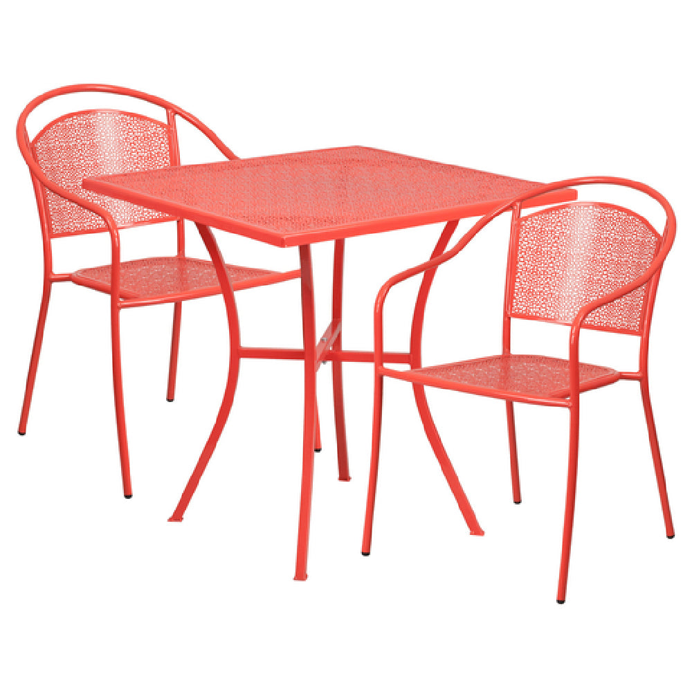The Flash Furniture CO-28SQ-03CHR2-RED-GG Patio Table Set is a meticulously designed ensemble crafted for versatile indoor and outdoor use. This set includes one square table with dimensions of 28 inches wide, 28 inches deep, and 28-1/4 inches high. The table features a rain flower design top with a 1-inch edge, which not only enhances its aesthetic appeal but also ensures durability in various weather conditions. Accompanying the table are two stacking armchairs, each equipped with a round back and rain flower design back and seat, providing a cohesive and stylish look. The chairs are built with a robust 1.2mm tubular steel frame, offering a substantial weight capacity of up to 300 pounds. This design allows the chairs to stack up to eight high, maximizing storage efficiency. Each piece is finished with a coral powder coat for added protection and visual appeal, and plastic floor glides are included to protect flooring surfaces. The set is shipped in two boxes and requires assembly, with in-stock items typically shipping within 24 hours. This Flash Furniture patio set is an ideal choice for residential or commercial settings, offering a perfect blend of style, durability, and functionality.