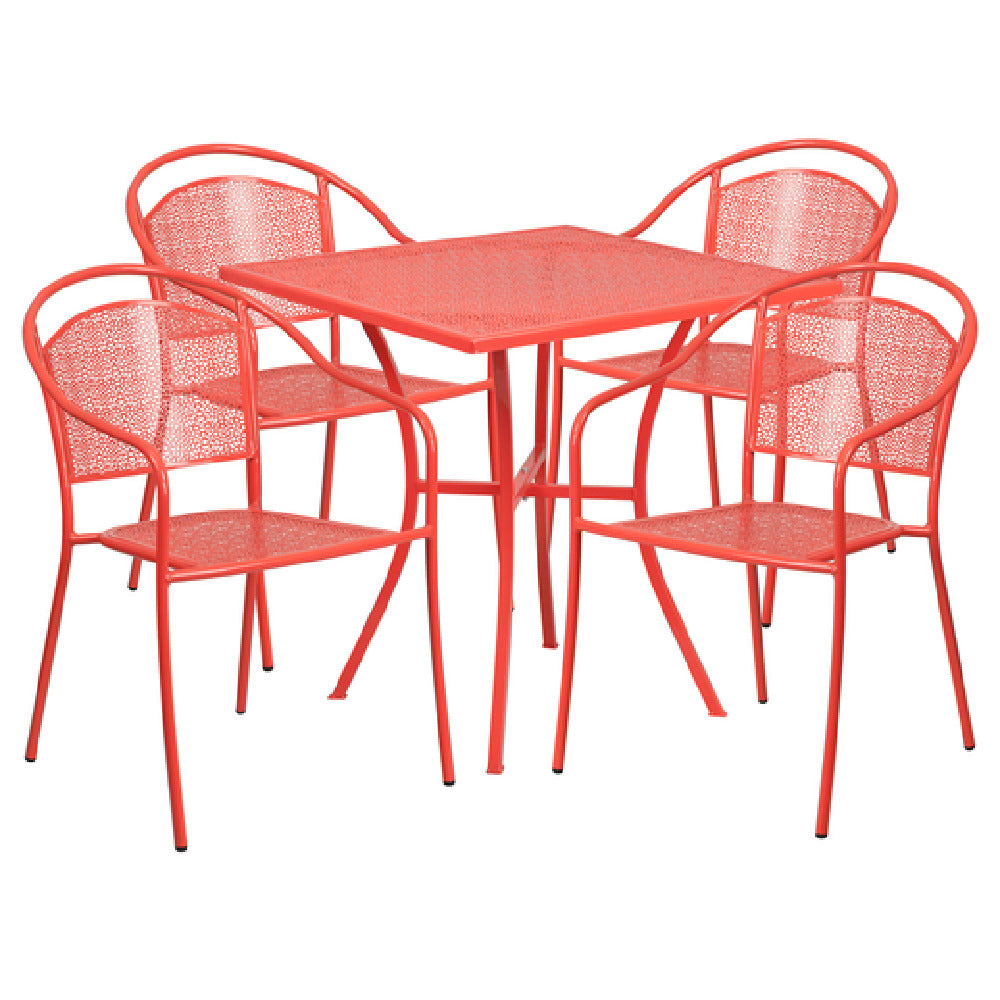The Flash Furniture CO-28SQ-03CHR4-RED-GG Patio Table Set is an elegantly designed ensemble, perfect for both indoor and outdoor dining experiences. This set includes a square table with dimensions of 28 inches in width, 28 inches in depth, and 28-1/4 inches in height. The table's distinctive rain flower design top adds a touch of sophistication, complemented by a 1-inch edge for added style. Accompanying the table are four stacking armchairs, each featuring a round back and a rain flower design on the back and seat, providing both aesthetic appeal and comfort. Constructed with a 1.2mm tubular steel frame, each chair boasts a weight capacity of up to 300 pounds and can be stacked up to 8 chairs high, making storage convenient. The chairs also include plastic floor glides to protect surfaces. Finished with a durable coral-colored powder coat, this set is designed to withstand various weather conditions, making it an excellent choice for patios, gardens, or cafes. Shipped in two boxes, the set requires assembly and typically ships within 24 hours when in stock. The Flash Furniture CO-28SQ-03CHR4-RED-GG Patio Table Set embodies a blend of functionality and style, catering to diverse outdoor and indoor settings.