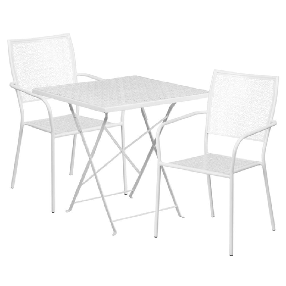 The Flash Furniture CO-28SQF-02CHR2-WH-GG Patio Table Set is a practical and stylish solution for both indoor and outdoor spaces, engineered to meet diverse seating needs with high functionality. This set includes one folding table, measuring 28 inches in width, 28 inches in depth, and 28-1/4 inches in height, featuring a distinctive square shape with a rain flower design top and a 1-inch edge. The table is supported by a center brace and equipped with protective floor caps to ensure stability and protect surfaces. Accompanying the table are two stacking arm chairs, each with a square back and a rain flower design on the back and seat, constructed with a 1.2mm tubular steel frame. Each chair supports up to 300 pounds and can be stacked up to 8 chairs high for efficient storage. The chairs also include plastic floor glides for easy movement across various surfaces. Finished with a durable white powder coat, this furniture set is shipped in two boxes and is typically ready for dispatch within 24 hours. Its design and construction cater to a broad range of environments, providing flexibility, durability, and aesthetic appeal for residential and commercial settings alike.