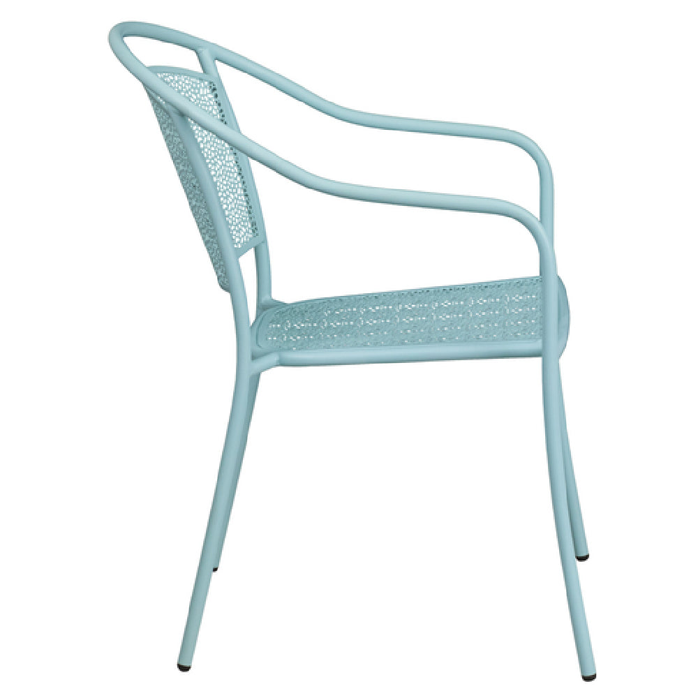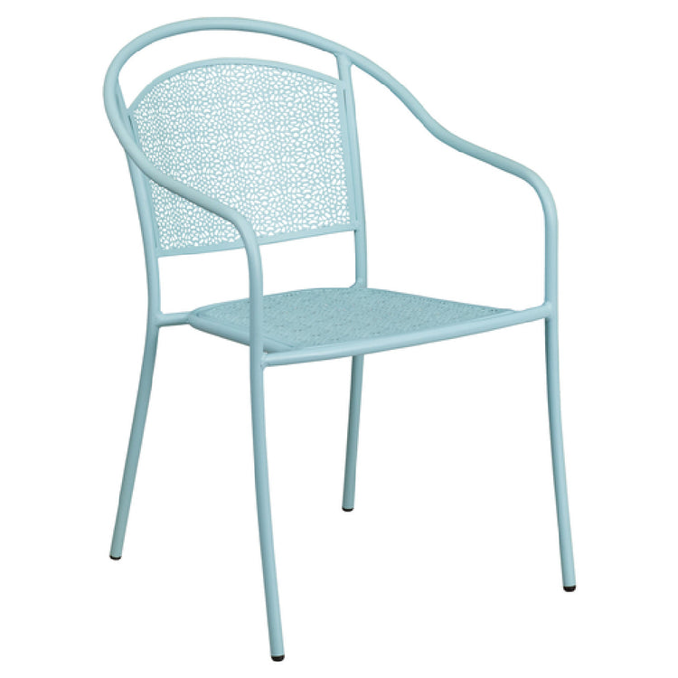 Flash Furniture CO-3-SKY-GG Patio Stacking Armchair exemplifies versatile and practical seating with its unique rain flower seat and back design, perfect for both indoor and outdoor spaces. This chair features a curved round back adding ergonomic comfort and is built with a robust 1.2mm tubular steel frame. Its sky blue powder coat finish not only enhances its aesthetic appeal but also provides durability against the elements, making it suitable for residential patios or commercial outdoor seating areas. With plastic floor glides, it ensures easy movement and protection for floor surfaces, further emphasizing its thoughtful design. The lightweight nature of this chair makes it easy to reposition, while its ability to stack up to 8 chairs high provides efficient storage solutions, ideal for venues needing flexible seating arrangements. Designed to cater to both commercial and residential markets, this armchair is a reliable choice for those seeking style, practicality, and durability. The chair's in-stock availability typically allows for shipping within 24 hours, meeting the demands of businesses and individuals who value prompt service and delivery. Its combination of design and functionality positions it as an excellent seating option across various environments.