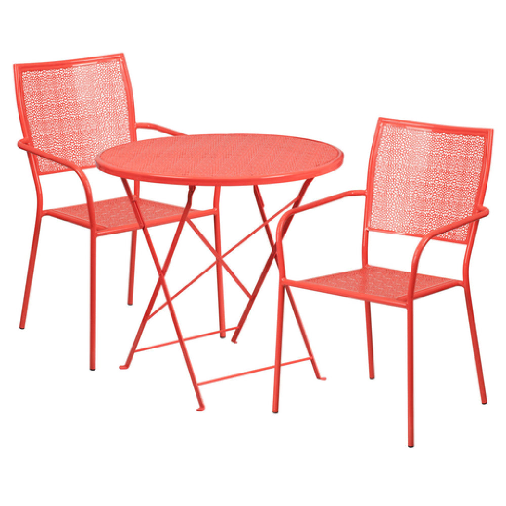 The Flash Furniture CO-30RDF-02CHR2-RED-GG Patio Table Set stands out with its practical and stylish design, making it a versatile choice for various settings. This set includes a folding table measuring 30" in diameter and 28" in height, featuring a round structure with a unique rain flower design top. The table is equipped with a 1" edge and a center brace for enhanced stability, complemented by protective floor caps to prevent damage to surfaces. Accompanying the table are two stacking arm chairs, designed with a square back and a matching rain flower pattern on the back and seat. The chairs are constructed from a durable 1.2mm tubular steel frame, supporting a weight capacity of up to 300 lbs. These chairs can be conveniently stacked up to 8 high, making storage and transport hassle-free. The entire set is finished with a coral powder coat, offering protection against the elements, allowing for both indoor and outdoor use. Additionally, plastic floor glides on the chairs ensure smooth movement across floors. Delivered in two boxes, this patio table set offers a practical solution for both commercial and residential environments, typically shipping within 24 hours of order placement.