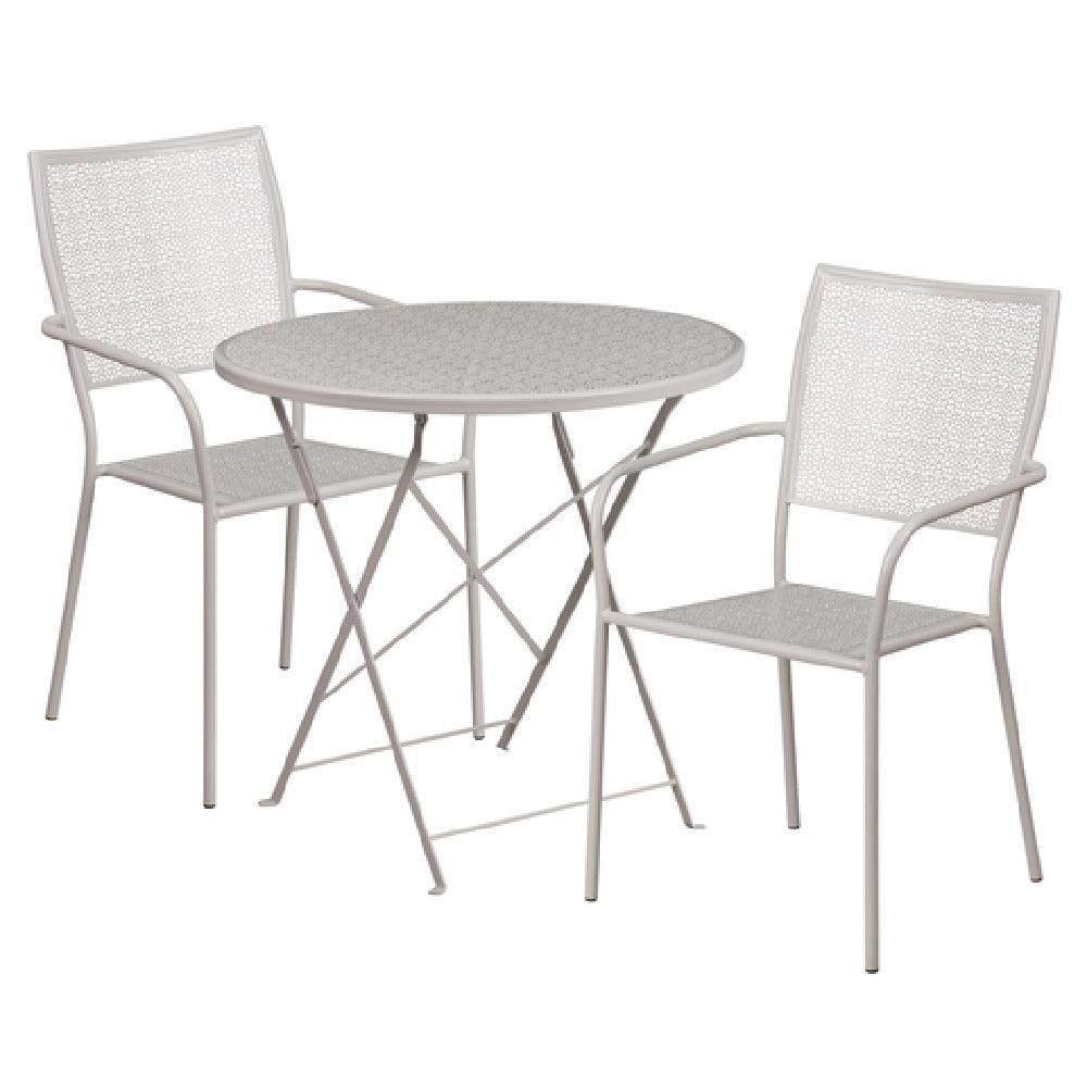 The Flash Furniture CO-30RDF-02CHR2-SIL-GG Patio Table Set is a versatile and stylish addition to both indoor and outdoor spaces, perfect for residential and commercial settings. This set features a folding table with dimensions of 30 inches in diameter and 28 inches in height, showcasing a unique rain flower design top with a 1-inch edge and supported by a center brace for enhanced stability. The set includes two stacking armchairs, each with a square back and matching rain flower design on the back and seat. Crafted from a robust 1.2mm tubular steel frame, each chair supports up to 300 pounds and can be stacked up to eight chairs high, optimizing storage space. The chairs are equipped with plastic floor glides to protect flooring surfaces. Both the table and chairs boast a powder-coated finish in light gray, ensuring durability and resistance to weather conditions. Additionally, protective floor caps on the table and the chairs enhance the longevity of your flooring. This patio set is shipped in two boxes and is typically ready for dispatch within 24 hours, making it a convenient choice for quick setup and immediate use.