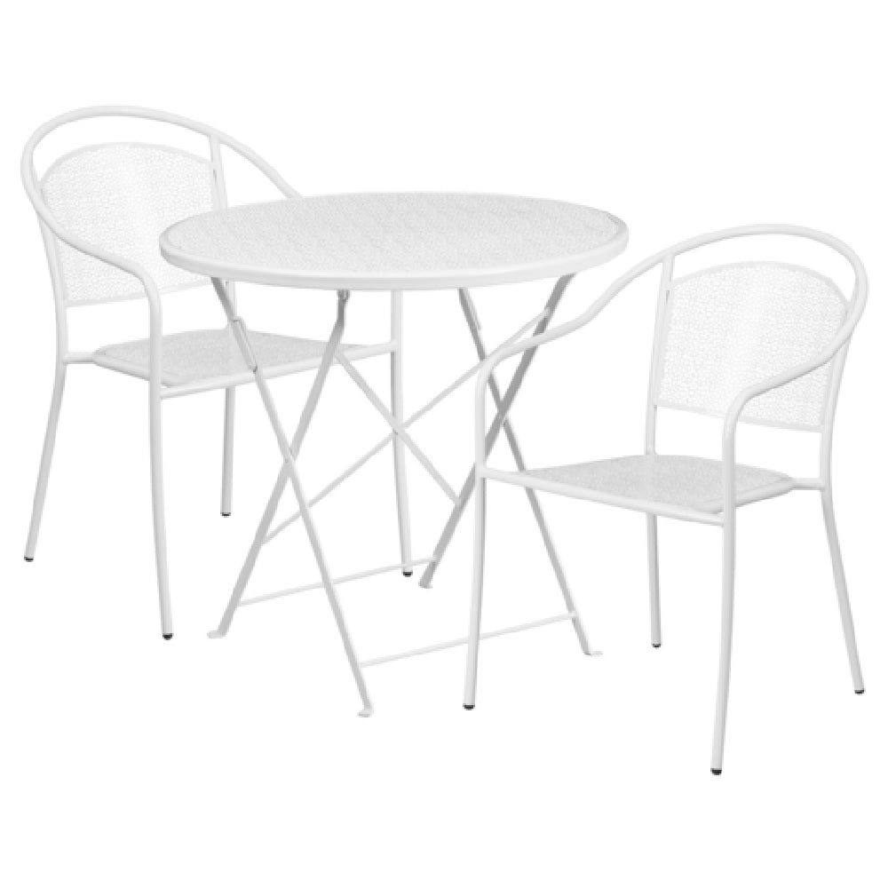 The Flash Furniture CO-30RDF-03CHR2-WH-GG Patio Table Set is a versatile addition to any indoor or outdoor space, designed with both style and functionality in mind. This set includes a folding table measuring 30 inches in diameter and 28 inches in height, featuring a distinctive round rain flower design top with a 1-inch edge and a center brace for added stability. Complementing the table are two stacking armchairs, each with a round back and rain flower design on the back and seat, supported by a durable 1.2mm tubular steel frame. These chairs can accommodate up to 300 pounds and stack up to 8 chairs high for convenient storage. The set is equipped with protective floor caps and plastic floor glides to prevent damage to surfaces, making it suitable for various environments. Finished with a white powder coat, the set is both aesthetically pleasing and resilient to outdoor elements. Shipped in two boxes and typically dispatched within 24 hours, the Flash Furniture CO-30RDF-03CHR2-WH-GG Patio Table Set delivers a blend of elegance and practicality, catering to different market segments seeking durable and stylish outdoor furniture solutions.
