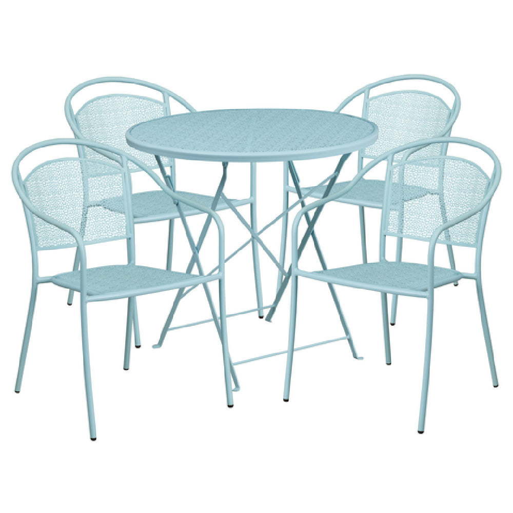The Flash Furniture CO-30RDF-03CHR4-SKY-GG Patio Table Set is a versatile addition to any indoor or outdoor space, appealing to both residential and commercial markets. The set includes a folding table with a 30-inch diameter and 28-inch height, featuring a round design with a distinctive rain flower pattern on the tabletop. The table is supported by a 1-inch edge and a center brace for added stability, and it comes equipped with protective floor caps to prevent surface damage. Accompanied by four stacking armchairs, each chair boasts a round back and matching rain flower design on the back and seat, with a durable 1.2mm tubular steel frame that can support up to 300 pounds. These chairs are designed to stack up to eight chairs high, offering convenient storage options. The entire set is crafted from steel with a powder coat finish in a striking sky blue color, enhancing both durability and aesthetic appeal. Additionally, plastic floor glides are included to safeguard indoor floors. This patio set is shipped in two boxes, and in-stock items typically ship within 24 hours, making it an ideal choice for those seeking a blend of style, functionality, and quick availability.