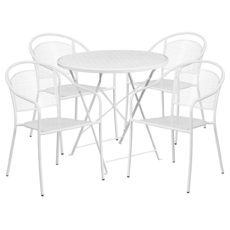 The Flash Furniture CO-30RDF-03CHR4-WH-GG Patio Table Set is a meticulously designed ensemble that combines functionality with elegance, making it a versatile choice for both indoor and outdoor settings. This set includes a folding table with dimensions of 30 inches in diameter and 28 inches in height, featuring a distinctive round rain flower design top and a 1-inch edge, supported by a robust center brace. The set also includes four stacking arm chairs, each designed with a round back and a rain flower pattern on both the back and seat. The chairs are constructed with a 1.2mm tubular steel frame, delivering a sturdy 300 lb. weight capacity, and can be stacked up to 8 chairs high for efficient storage. Each chair is equipped with plastic floor glides to protect surfaces while enhancing stability. The entire set is finished with a durable white powder coat, ensuring longevity against the elements, thus making it suitable for various environments. The product is shipped in two boxes and is typically available for dispatch within 24 hours of ordering, underscoring its accessibility for diverse market segments that demand both style and practicality in furniture solutions.