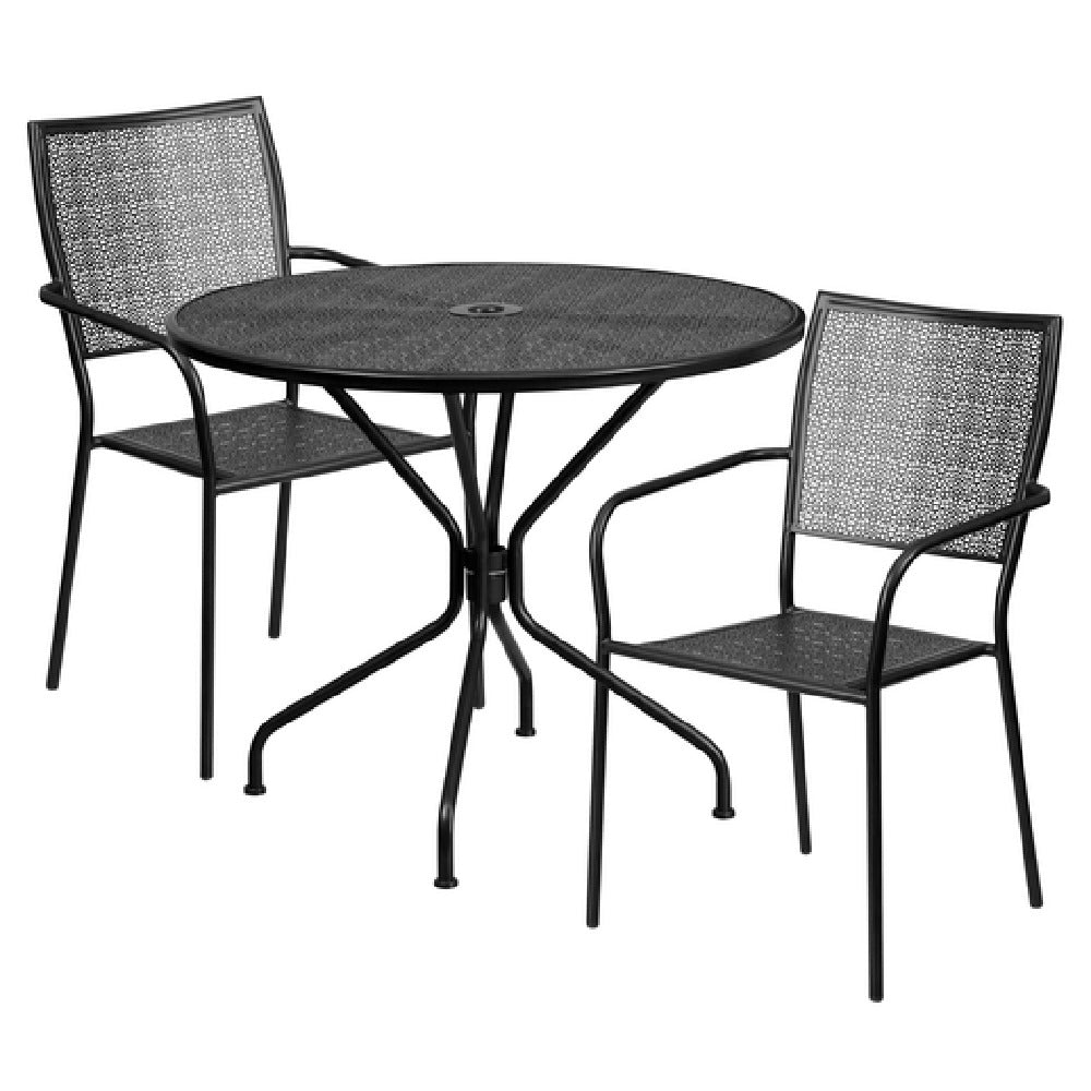 The Flash Furniture CO-35RD-02CHR2-BK-GG Patio Table Set is an expertly designed addition for both indoor and outdoor settings, combining functionality with elegance. The set includes a round table measuring 35-1/4" in diameter and 28-3/4" in height, featuring a rain flower design top and a 1-1/2" diameter umbrella hole, making it suitable for shaded outdoor enjoyment. Its 1" edge adds a refined touch, enhancing its aesthetic appeal. This set also includes two stacking arm chairs, each with a square back and a matching rain flower design on the back and seat, providing a harmonious look. The chairs boast a sturdy 1.2mm tubular steel frame with a powder coat finish in black, ensuring durability and a weight capacity of up to 300 lbs. The chairs can be stacked up to 8 high, offering easy storage when not in use. Designed with plastic floor glides, this set protects surfaces and enhances mobility. Assembly is required, and the set is shipped in two boxes, with in-stock items typically shipping within 24 hours. This patio table set is ideal for cafes, restaurants, and home gardens, offering a blend of style, strength, and practicality.