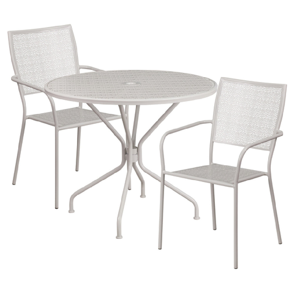 The Flash Furniture CO-35RD-02CHR2-SIL-GG Patio Table Set is a well-crafted ensemble designed for both aesthetic appeal and functionality, suitable for diverse environments such as home patios, cafes, and outdoor dining areas. It features a round table with a diameter of 35-1/4 inches and a height of 28-3/4 inches, showcasing a rain flower design top that adds a touch of elegance. The table is equipped with a 1-1/2 inch diameter umbrella hole, providing the option to add shade. The set includes two stacking arm chairs, each designed with a square back and a rain flower pattern on the back and seat. These chairs are supported by a robust 1.2mm tubular steel frame with a weight capacity of 300 pounds, ensuring durability and stability. The chairs are stackable up to eight high, making storage convenient. The entire set is made of steel with a light gray powder coat finish, making it suitable for both indoor and outdoor use. Protective plastic floor glides are included to prevent damage to surfaces. The set requires assembly and is shipped in two boxes, typically within 24 hours of ordering, making it a practical and stylish choice for various outdoor spaces.