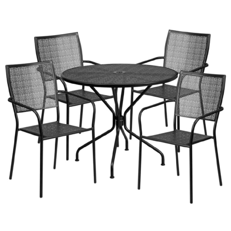 The Flash Furniture CO-35RD-02CHR4-BK-GG Patio Table Set is meticulously designed for both style and function, featuring a 35-1/4" diameter round table with a height of 28-3/4". The table boasts a unique rain flower design top, complemented by a 1-1/2" diameter umbrella hole for added versatility. The 1" edge adds a subtle detail to the elegant design. Accompanying the table are four stacking arm chairs, each designed with a square back and matching rain flower design on the back and seat. Crafted from a durable 1.2mm tubular steel frame, these chairs support a weight capacity of up to 300 lbs and can be stacked up to 8 chairs high, making them ideal for convenient storage. The inclusion of plastic floor glides ensures protection for both indoor and outdoor surfaces. Finished with a durable powder coat, the black steel construction offers resilience against the elements. This set requires assembly and is delivered in two boxes for efficient shipping, with in-stock items typically dispatched within 24 hours. The Flash Furniture CO-35RD-02CHR4-BK-GG Patio Table Set is an exceptional choice for diverse environments, combining durability with a contemporary aesthetic for a wide range of settings.