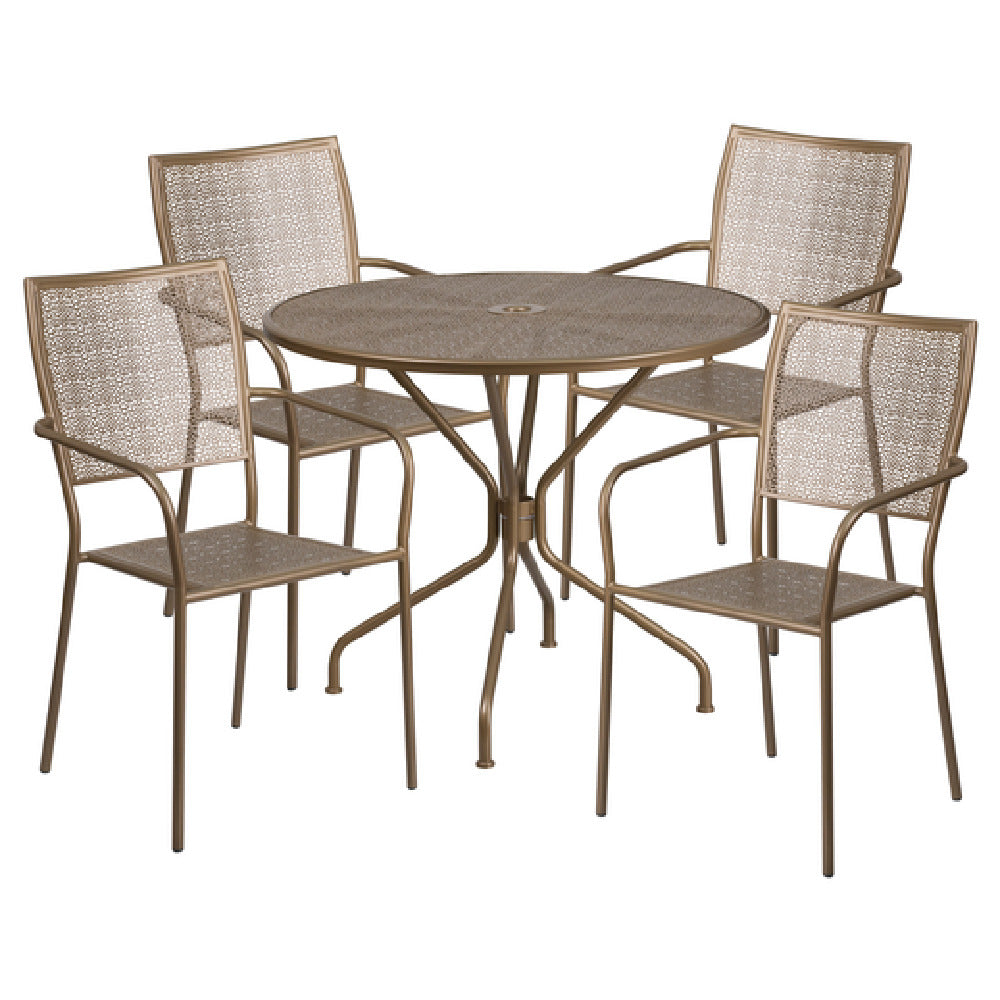 Flash Furniture CO-35RD-02CHR4-GD-GG Patio Table Set presents a versatile and stylish option for both indoor and outdoor settings, suitable for a variety of market segments. This set includes one round table with a diameter of 35-1/4 inches and a height of 28-3/4 inches, featuring an elegant rain flower design top with a 1-1/2 inch diameter umbrella hole and a 1-inch edge for added aesthetic appeal. Accompanying the table are four stacking arm chairs, each with a square back and rain flower design on both the back and seat, crafted from a robust 1.2mm tubular steel frame capable of supporting up to 300 pounds. The chairs are stackable up to eight high, optimizing space for storage. All components are finished with a durable gold powder coat, ensuring resistance to outdoor elements. Plastic floor glides protect surfaces during use. This patio set is designed for easy assembly and ships in two boxes, with most in-stock items shipping within 24 hours. The Flash Furniture CO-35RD-02CHR4-GD-GG is a testament to functional elegance, meeting the demands of residential, commercial, and hospitality environments by providing durable and stylish seating and dining solutions.