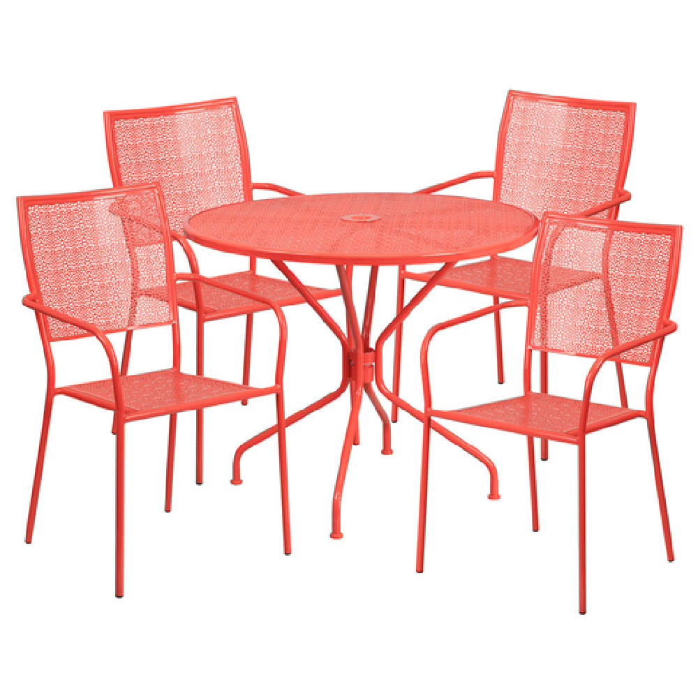 The Flash Furniture CO-35RD-02CHR4-RED-GG Patio Table Set stands out with its stylish design and practical features, catering to both residential and commercial spaces. This set includes one round table with a diameter of 35-1/4 inches and a height of 28-3/4 inches, featuring a rain flower design top and a 1-1/2 inch diameter umbrella hole, enhanced by a 1-inch edge. Accompanying the table are four stacking armchairs, each designed with a square back and matching rain flower design on both the back and seat. The chairs are built with a 1.2mm tubular steel frame, supporting up to 300 pounds, and can be stacked up to eight chairs high for efficient storage. The set's adaptability is showcased in its plastic floor glides, making it ideal for both indoor and outdoor use. Constructed from durable steel with a powder coat finish in a vibrant coral color, this patio set requires assembly and is shipped in two boxes. Typically, in-stock items are dispatched within 24 hours, ensuring prompt availability. This combination of design, durability, and versatility makes the Flash Furniture Patio Table Set a unique and valuable addition to various environments, from casual home settings to dynamic commercial venues.