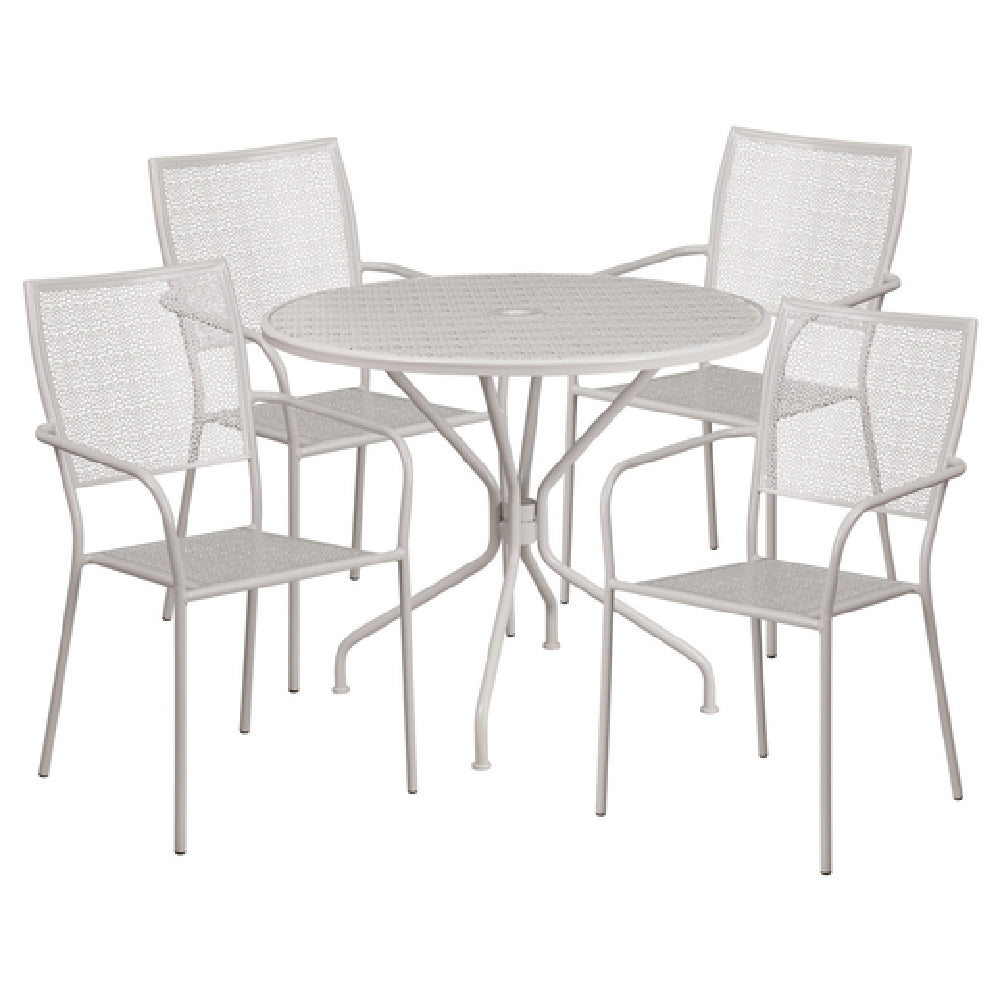 The Flash Furniture CO-35RD-02CHR4-SIL-GG Patio Table Set is a meticulously designed ensemble comprising one round table and four stacking arm chairs, tailored for versatile use. The table measures 35-1/4" in diameter and stands at 28-3/4" high, featuring a distinctive rain flower design top, complemented by a 1-1/2" diameter umbrella hole and a 1" edge for added functionality. The accompanying chairs, known for their square back and matching rain flower design on both back and seat, are constructed with a sturdy 1.2mm tubular frame. Each chair can support up to 300 lbs and boasts the capability of stacking up to eight chairs high, offering practical storage solutions. Designed for both indoor and outdoor settings, this set is crafted from durable steel with a powder coat finish in light gray, enhancing its resilience and aesthetic appeal. Plastic floor glides are included to protect flooring surfaces, and assembly is required upon delivery, which is facilitated in two separate boxes. Flash Furniture's patio table set typically ships within 24 hours when in stock, ensuring prompt availability for various market segments seeking durable, stylish, and functional outdoor furniture solutions.