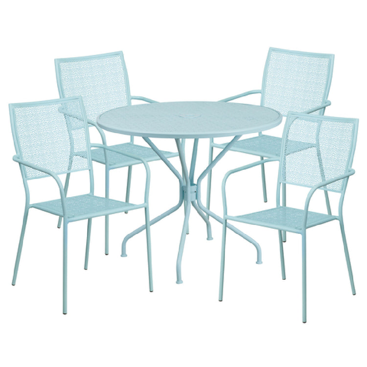 The Flash Furniture CO-35RD-02CHR4-SKY-GG Patio Table Set is an expertly crafted ensemble designed for both indoor and outdoor settings. It features a round table with a diameter of 35-1/4 inches and a height of 28-3/4 inches, adorned with a unique rain flower design top. An integrated 1-1/2 inch diameter umbrella hole provides versatility for sunshade additions, and the table is bordered by a 1-inch edge for added durability. Complementing the table, the set includes four stacking armchairs, each designed with a square back and rain flower motif on both the back and seat. The chairs boast a robust 1.2mm tubular frame and are engineered to support up to 300 pounds, supporting a wide range of users. They are also stackable, accommodating up to eight chairs high, promoting efficient storage. Equipped with plastic floor glides, these chairs ensure smooth movement without floor damage. Constructed with steel and finished with a powder coat in a striking sky blue color, this patio set promises both resilience and style. Assembly is required, and the set ships in two boxes, with in-stock items typically dispatched within 24 hours, making it a convenient choice for consumers seeking immediate enjoyment.