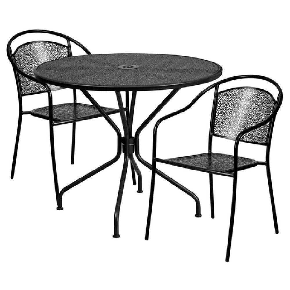The Flash Furniture CO-35RD-03CHR2-BK-GG Patio Table Set combines functionality and style, ideal for both residential and commercial outdoor spaces. This set includes a round table measuring 35-1/4 inches in diameter and standing 28-3/4 inches tall, featuring a unique rain flower design that adds a touch of elegance. The table is equipped with a 1-1/2 inch diameter umbrella hole, allowing for ease in adding sun protection. The set comes with two stacking arm chairs, each designed with a round back and matching rain flower pattern on both the back and seat, offering a cohesive aesthetic. Constructed with a sturdy 1.2mm tubular steel frame, each chair boasts a weight capacity of 300 pounds and can stack up to eight chairs high for efficient storage. The chairs also include plastic floor glides, providing smooth movement and protecting your patio surface. With a durable powder coat finish in black, this set is designed for both indoor and outdoor use, ensuring versatility and longevity. Some assembly is required, and the product is shipped in two boxes, typically dispatched within 24 hours if in stock, making it a practical and stylish choice for enhancing any patio or garden setting.