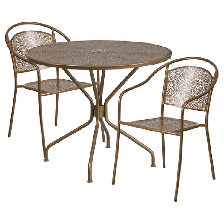 The Flash Furniture CO-35RD-03CHR2-GD-GG Patio Table Set is a versatile and elegant addition to any indoor or outdoor space. This set features a round table with a diameter of 35-1/4 inches and a height of 28-3/4 inches, making it a perfect fit for both small and large areas. The table's top is designed with a unique rain flower pattern, adding aesthetic appeal while ensuring durability. It includes a 1-1/2 inch diameter umbrella hole for those sunny days when added shade is desired. This set also comes with two stacking armchairs, each boasting a round back and matching rain flower design on both the back and seat. Constructed with a 1.2mm tubular steel frame and a sleek powder coat finish in gold, these chairs offer a weight capacity of 300 pounds and can be stacked up to eight chairs high for convenient storage. Additionally, the chairs are equipped with plastic floor glides to protect your surfaces. Shipped in two boxes and requiring assembly, this patio table set is designed to be both functional and stylish, suitable for various market segments from home patios to commercial outdoor settings, offering a blend of resilience and design sophistication.