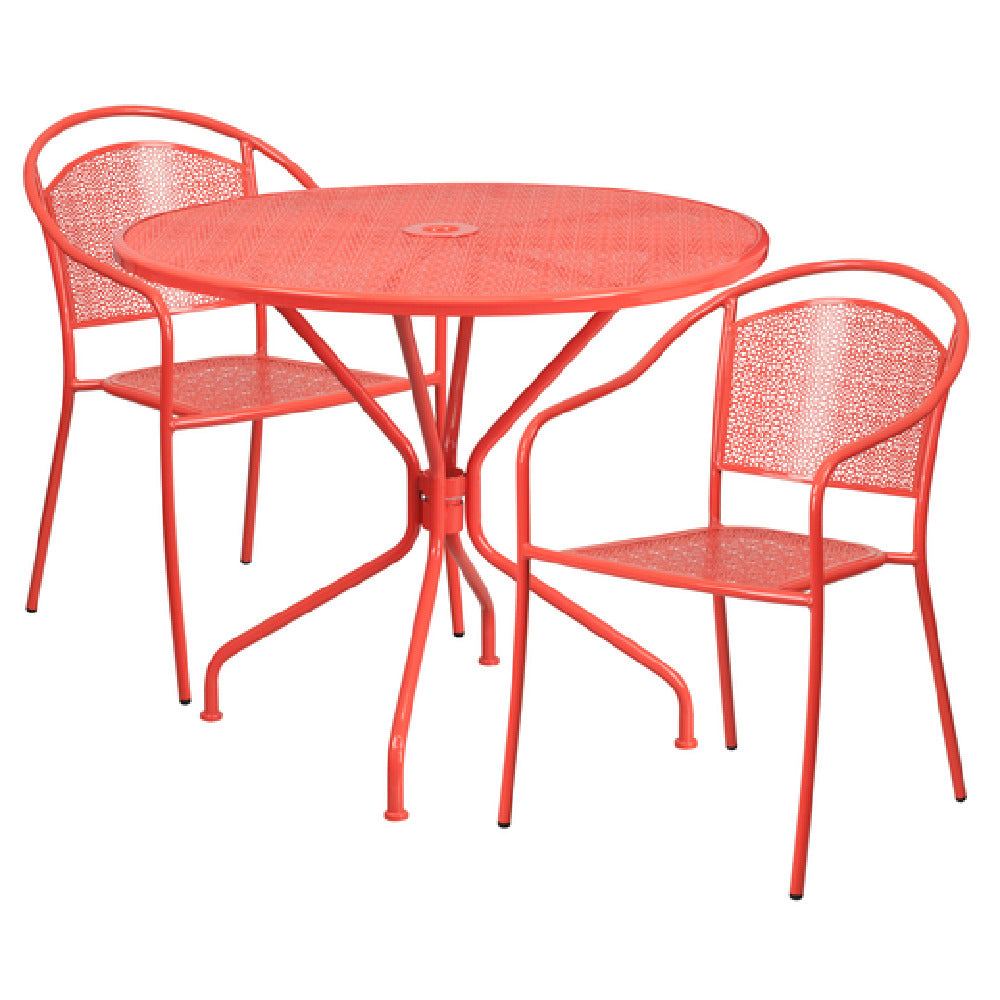 Flash Furniture CO-35RD-03CHR2-RED-GG Patio Table Set is a thoughtfully designed set, perfect for enhancing both indoor and outdoor settings. This set includes a single table with dimensions of 35-1/4" diameter and 28-3/4" height, featuring a charming rain flower design top and a 1-1/2" diameter umbrella hole for added functionality. The table's 1" edge adds to its sleek appearance. This set also includes two stacking arm chairs characterized by their round back and matching rain flower design on both back and seat. Each chair is built with a sturdy 1.2mm tubular steel frame, ensuring durability with a weight capacity of 300 pounds. The chairs can be stacked up to 8 high, providing convenient storage solutions. The coral-colored steel boasts a powder coat finish, offering resilience against various weather conditions, making it ideal for patios and garden spaces. Plastic floor glides protect surfaces, allowing seamless movement without scratches. Assembly is required, and the product ships in two boxes, usually within 24 hours if in stock. This patio set is a versatile choice for those seeking both style and practical design for their leisure spaces.