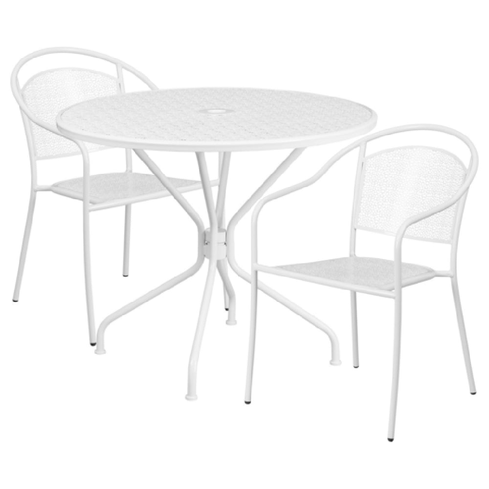 The Flash Furniture CO-35RD-03CHR2-WH-GG Patio Table Set is a versatile and stylish outdoor furniture choice, perfect for both residential and commercial settings. This set includes a round table measuring 35-1/4 inches in diameter and 28-3/4 inches in height, featuring a charming rain flower design top. The table is equipped with a 1-1/2 inch diameter umbrella hole and a 1-inch edge, providing functionality and convenience. Accompanying the table are two stacking arm chairs, each designed with a round back and rain flower pattern on both the back and seat. The chairs boast a sturdy 1.2mm tubular steel frame, supporting a weight capacity of up to 300 pounds. For ease of storage, these chairs can stack up to 8 high and include plastic floor glides to protect surfaces. Designed for both indoor and outdoor use, this patio set is crafted from durable steel with a powder coat finish in white, offering longevity and aesthetic appeal. Assembly is required, and the product is shipped in two boxes. This patio table set is typically in stock and ready for shipment within 24 hours, making it an efficient choice for quick updates to any patio or garden space.